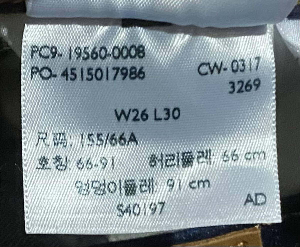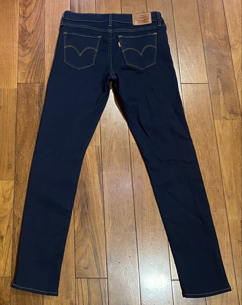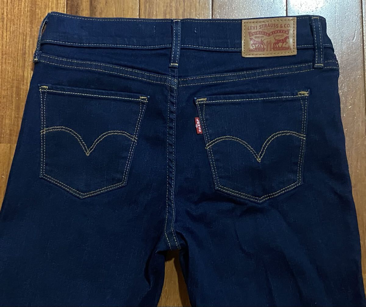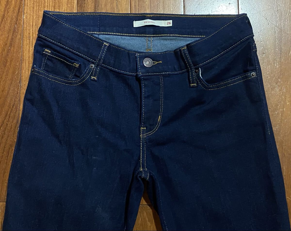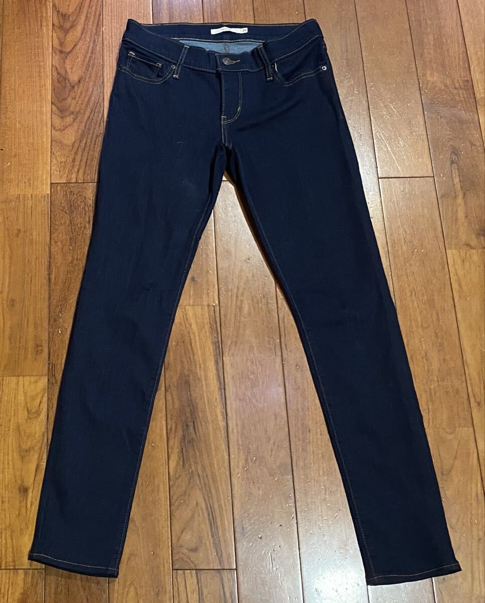 リーバイスのストレッチスキニーデニム(ジーンズ)、711 SKINNY 19560-0008です。色はインディゴブルーです。USEDですが状態は良いです(10段階中8程度)。生地はストレッチ入りで綿87%、ポリエステル12%、ポリウレタン1%です。牛革パッチ、ジッパーフライ、裾はチェーンステッチです。正規品です(中国製)。サイズはW26でウエストは重ねずに平置きで約71cm、ヒップ約80cm、股上約19cm、股下約71cm、股下15cmのふともも部分約40cm、裾まわり約25cm、重量約400gです。発送はゆうパケットポストになります。