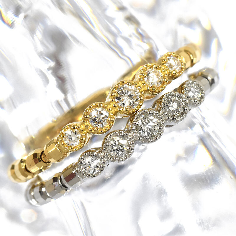 コメント | サイズフリーの伸縮性のあるリングです。 サイズが分からない方へのサプライズプレゼントはもちろん、 太ってサイズが変わる心配もなければ、いろんな指にはめてお楽しみ頂けます。 単体でも重ね付けでも上品な輝きを放つミラーボールです。 こちらは、ダイヤモンドの周りにはお花のようなミル打ちが施されており、アンティークな雰囲気を醸し出しています。 |