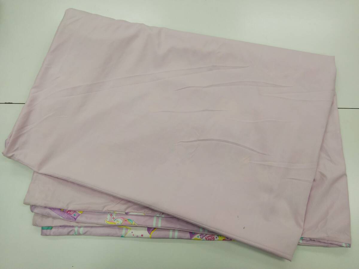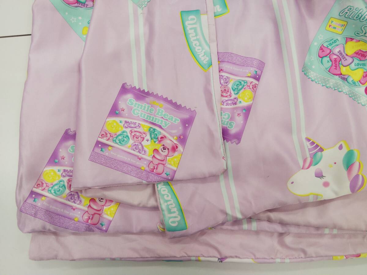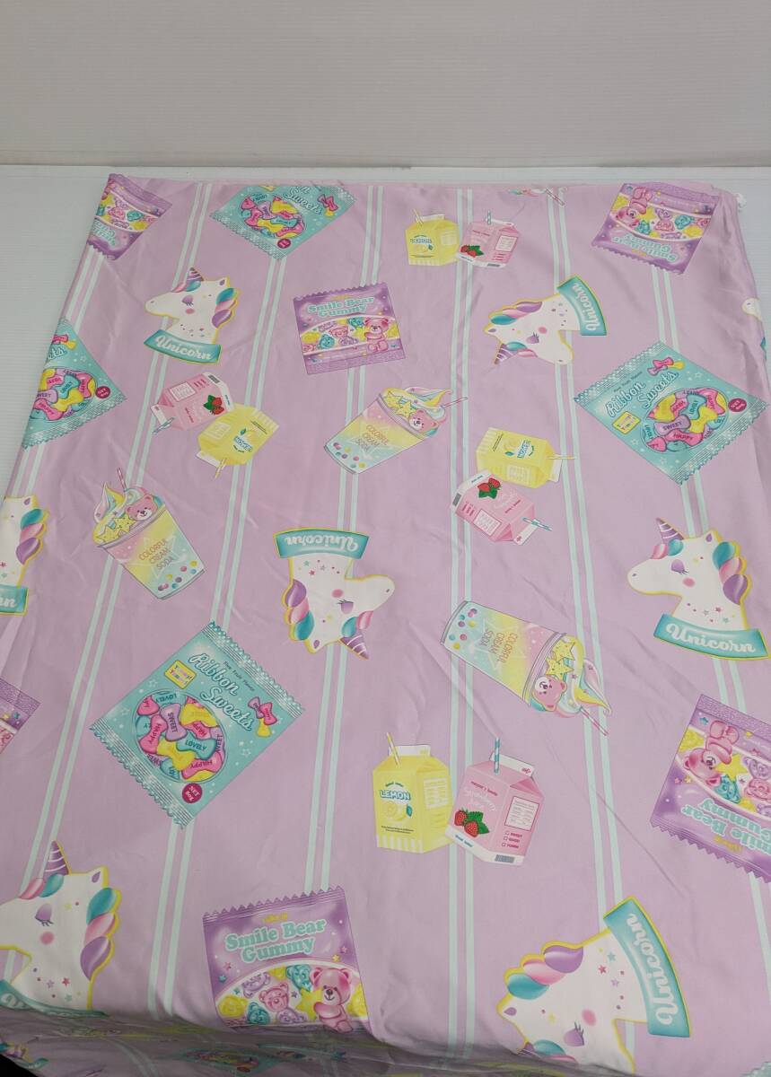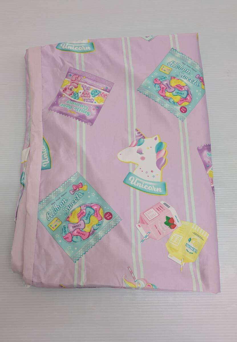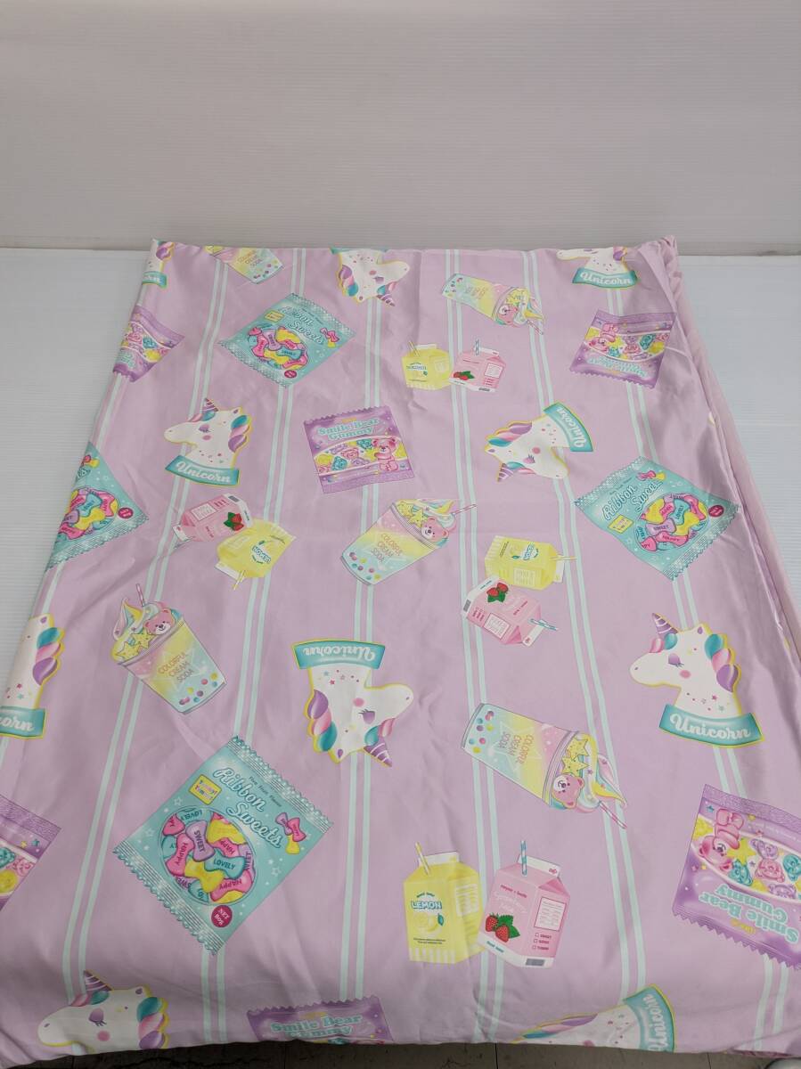 光沢のあるピンク地に(写真5参照)、ユニコーンやキャンディやジュースやミルクがちりばめられた、ポップな布団カバーです。