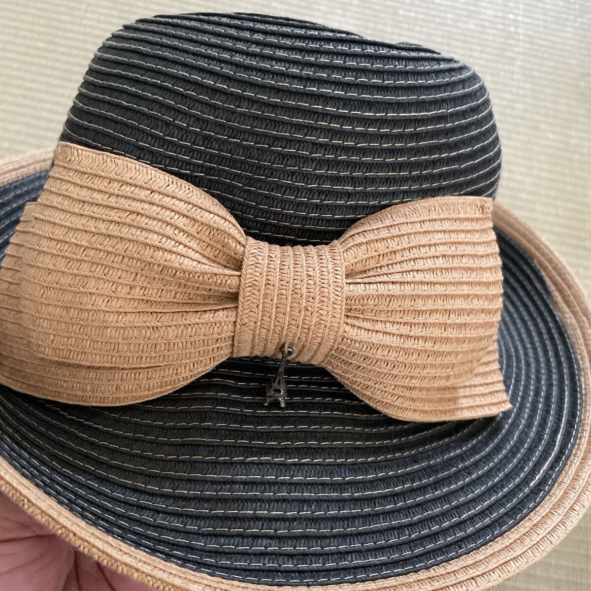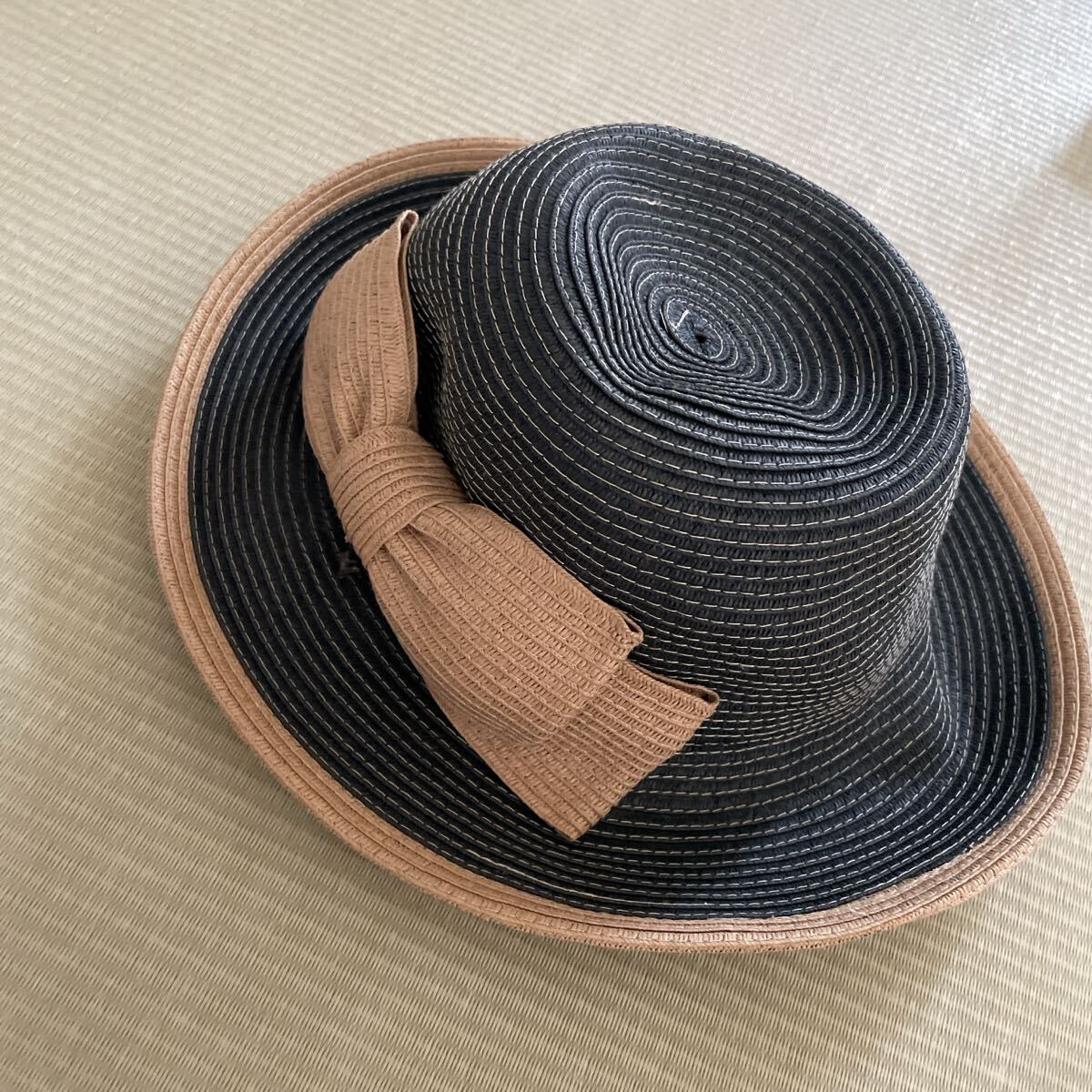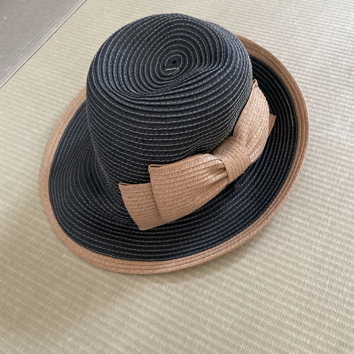 黒とベージュのストライプデザインのリボン付き麦わら帽子。