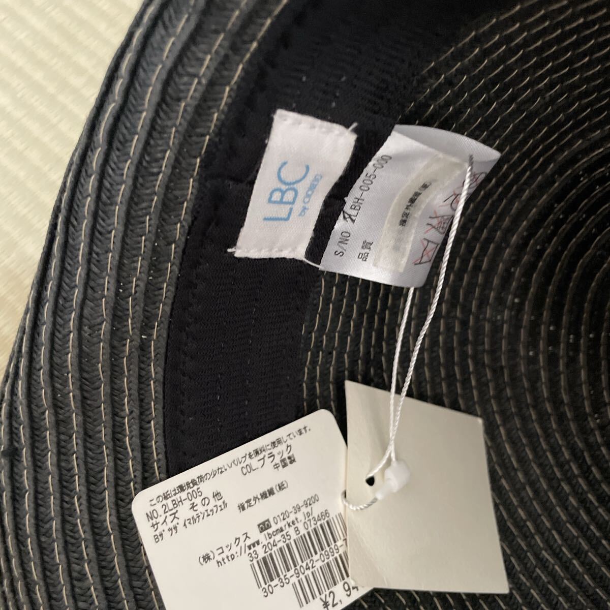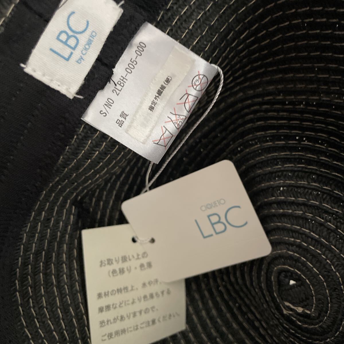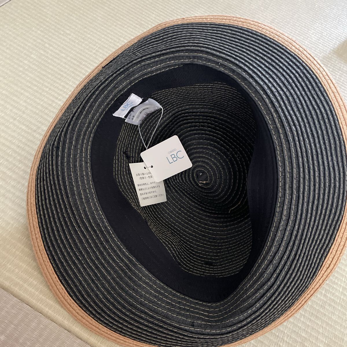 黒とベージュのストライプデザインのリボン付き麦わら帽子。