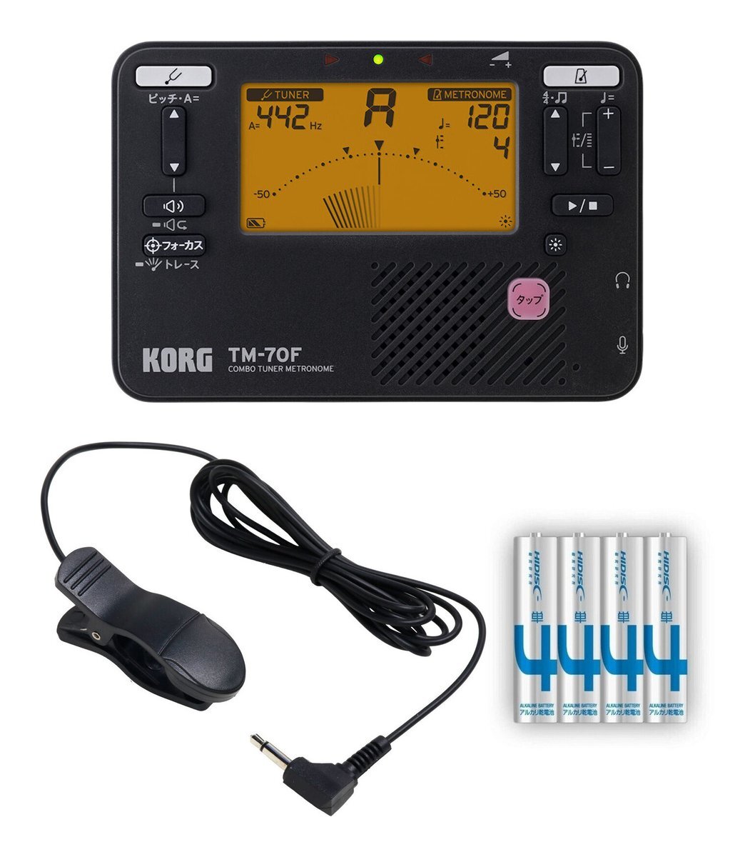 | コンパクトなボディに機能満載。チューナーとメトロノームが一体化したTMシリーズに、待望のニュー・モデル、TM-70F登場。 チューナーとメトロノームを同時に使用でき、多彩な機能と抜群の視認性を誇るTMシリーズは、管・弦楽器のチューニング及びリズム・トレーニング用アイテムとしてベストセラーを続けています。最新モデルのTM-70Fは、さらにボディの小型化に成功。ポケットにも収まるサイズながら、視認性のアップしたディスプレイ、よりチューニングの精度をアップするフォーカス・モードも新たに搭載し、使い勝手も向上しています。メトロノームやサウンドアウトの音質もパワーアップし、周りの音に埋もれることはありません。また、演奏の基本となるチューニングだからこそ品質も強化し、TM-70から生産地を日本へと変更しました。この“メイド・イン・ジャパン”の称号は、長年に渡り、コルグがチューナー/メトロノーム・シーンを牽引してきたというプライドと品質へのこだわりの証とも言えるのです。 ・チューニング機能とメトロノーム機能を同時に使用可能 ・幅広い楽器に対応するC1~C8のワイドな測定範囲 ・感度、視認性ともに良好な液晶針式メーター採用 ・よりチューニングの精度をアップするフォーカス・モード/トレース・モード ・TM-60から小型化しつつディスプレイの表記や表示方法を改善、視認性が向上 ・音の明瞭度がさらにアップしたメトロノーム/サウンドアウト/サウンドバック機能 ・様々なコンサート・ピッチに対応するキャリブレーション機能 ・純正な長/短3度の音程を示すマーク付き ・耳でのチューニングを身に付けられるサウンドアウト・モードとサウンドバック・モードを搭載 ・30~252回/分のワイドなテンポ範囲を持つメトロノーム。3タイプのテンポ設定、15種のリズム・バリエーションを搭載 ・電池寿命最大250時間のロングライフ設計 ・便利なメモリー・バックアップ機能、オート・パワー・オフ機能 ・本体を自立できる折りたたみ式スタンド付き ・各機能をアイコンで表示するユニバーサル・デザインを採用 ・ブラックとホワイトのカラー・バリエーション ・別売りコンタクト・マイクCM-400を使用して、より精度の高いチューニングが可能 よりコンパクトに、より使いやすくなったTM-70F チューナーとメトロノームが一体化したTMシリーズは、長年培ってきたコルグの技術の粋を集めたチューナー/メトロノームの決定版。前モデルのTM-60よりも一回り小型化しつつ、ディスプレイ部の音名・音階表示は大きくなりました。さらに液晶の視認性も向上したことで、様々な角度からも見やすくなり、ストレス無く精度の高いチューニングをサポートします。 管・弦楽器の音程をスピーディーに、正確に検出するチューナー部 C1~C8のワイドな測定範囲とレスポンス良好な液晶針式メーター 管・弦楽器を中心に様々な楽器の音名・音域測定が可能。C1(32.70Hz)~C8(4186.01Hz)の測定範囲で、低音楽器、倍音が多く音を拾いにくい楽器、さらにギター、ウクレレなどのアコースティック楽器のチューニングも簡単かつ正確に行えます。別売コンタクト・マイクCM-400を使用すれば、振動を直接チューナーに送ることができ、周囲に左右されない、確実なチューニングを行えます。また、コルグ独自の技術により、タイムラグなしで正確に音程を検出する液晶針式メーターは、管楽器の場合にロングトーンで生じやすい“音の揺れ”もきちんとチェックでき、ブレのない、安定した発音を身につけることができます。 よりチューニングの精度をアップするフォーカス・モード/トレース・モード 通常モードでは、±50セント内の表示画面ですが、フォーカス・モードでは、±25セントに拡大した表示画面になります。長短三度など、よりシビアなチューニングに対応し、練習を一段階レベルアップできます。また、過去2秒間に検出したピッチ範囲をメーターの下段に表示するトレース・モードも搭載。ロングトーンの安定感を確認するときに活用すると便利です。 純正な長/短3度の音程を示すマーク付き ブラス・バンドやオーケストラで合奏を行うとき、特にハーモニーのずれを感じやすい3度和音も、長3度と短3度のピッチを平均律から少しずらすことにより、耳に心地よい響きを得ることができます。TM-70のメーター・スケールには純正な長/短3度の音程を示すマークが入っており、それぞれのマークに指針が合うようにチューニングするだけで*、アンサンブル時に美しいハーモニーを奏でることができます。管楽器はもちろんのこと、声楽やア・カペラなどの練習にも便利です。*純正な長/短3度に合わせる場合、どの音を補正すれば良いかは演奏する音楽によって異なります。 基準音を発振するサウンドアウト・モード メーターによる目でのチューニング以外にも、本体スピーカーまたは接続したヘッドホンから基準音を発振することで、耳でのチューニングを行える「サウンドアウト・モード