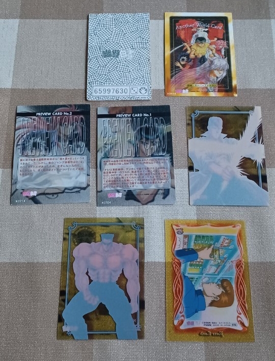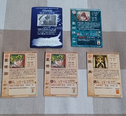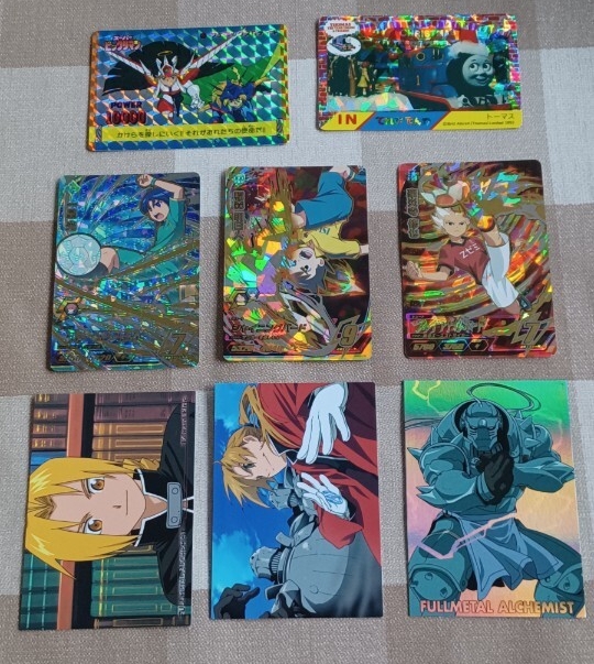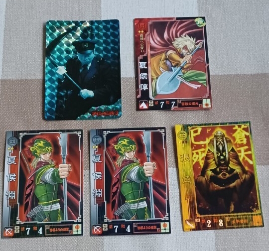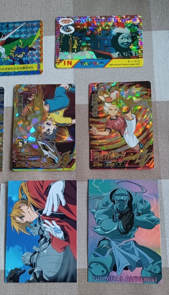 画像を確認の上判断下さい。イナズマイレブン星4キラカード、学校の怪談3カード、三國志大戦1と3でキラカードとノーマルカード、先程のタイトルの鋼の錬金術師についての説明でカードダスマスターズでキラとノーマルカード。