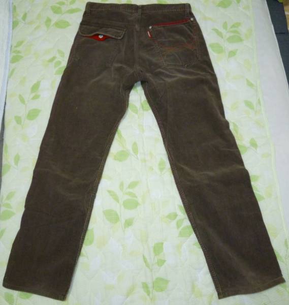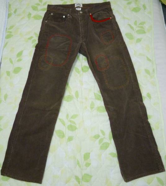 かなりデザイン性の高いパンツになり、茶色をベースに左ポケットにはフエルトでパイピング、ももとひざあたりには赤と茶色のステッチ、またバックポケットも二重になっていたりと細部まで手の込んだパンツになります。