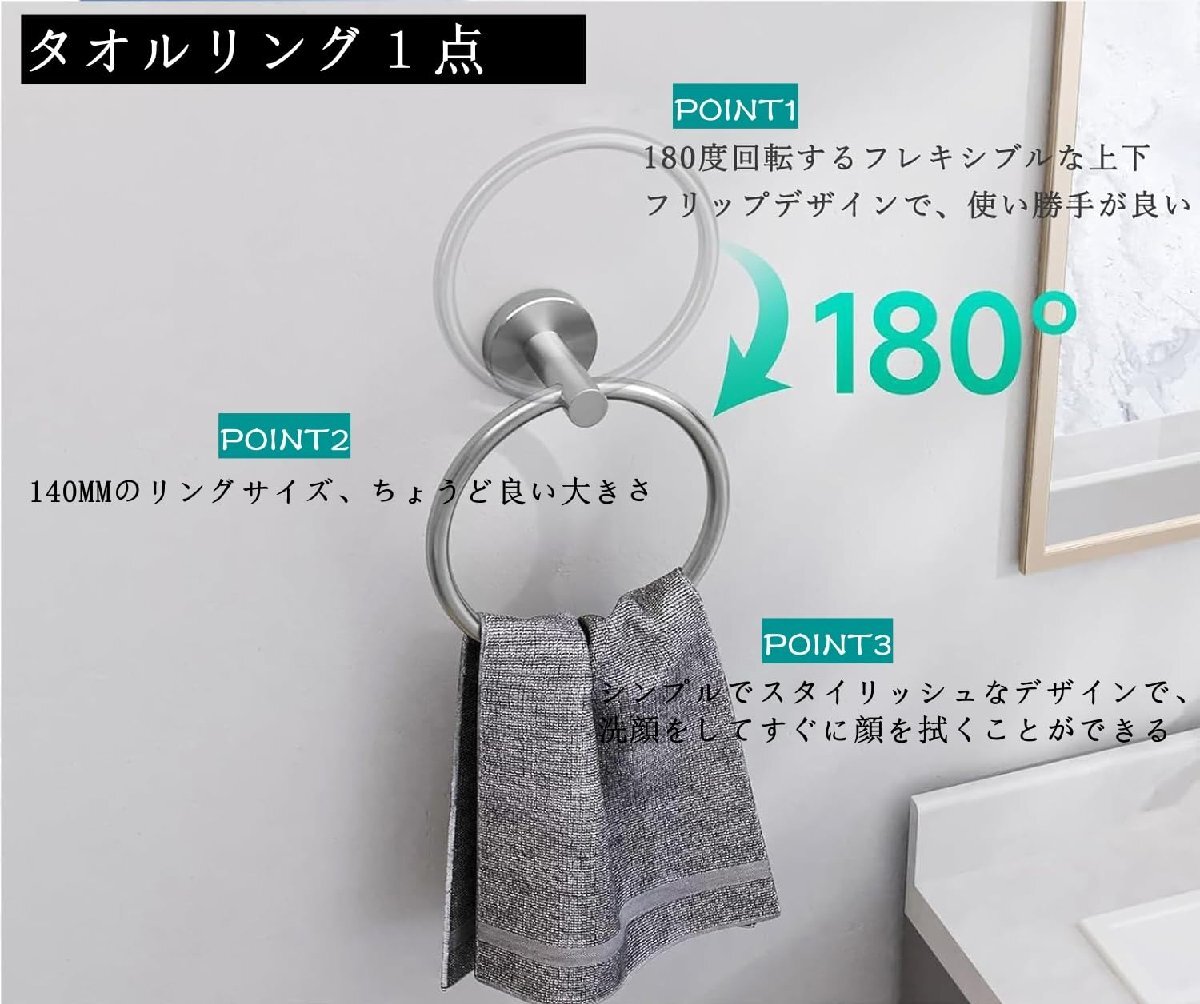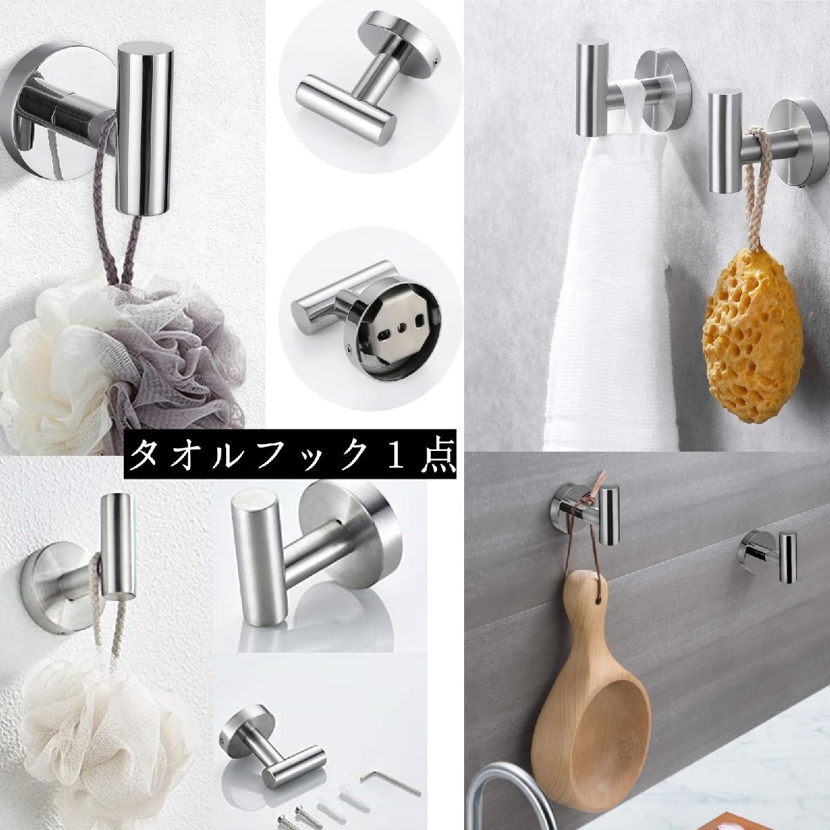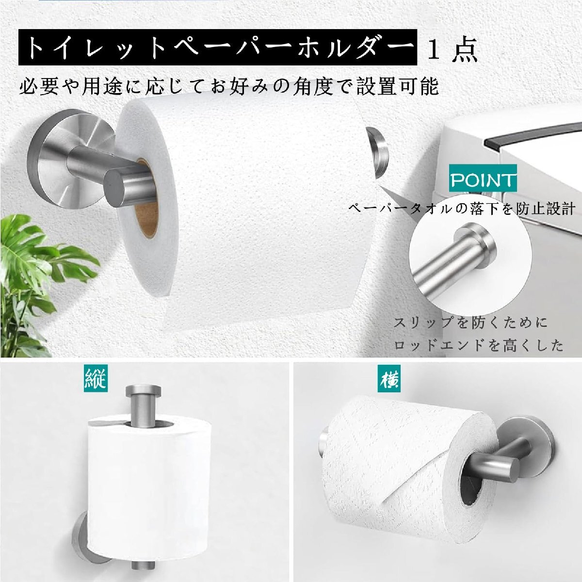 【パッケージ内容】タオルバー×1トイレットペーパーホルダー×1、タオルハンガーリング×1、コートフック×1