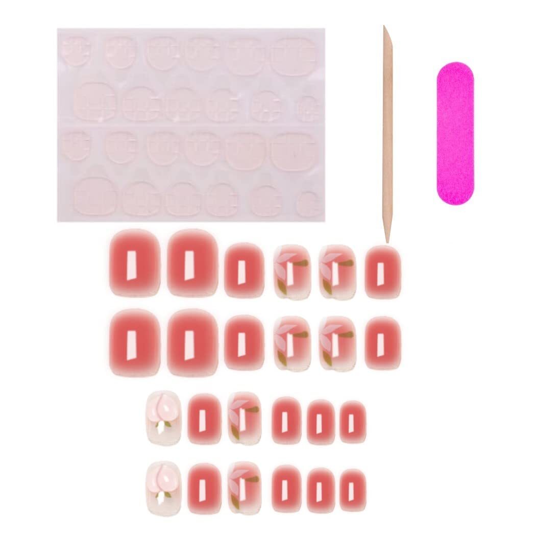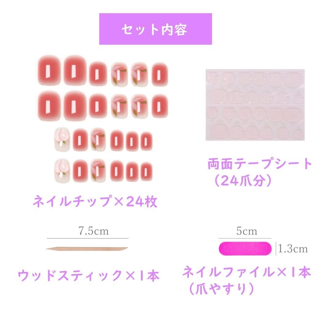 【セット内容】ネイルチップ24枚、両面テープ24枚、ネイルファイル(爪やすり)1個、ウッドスティック1本。