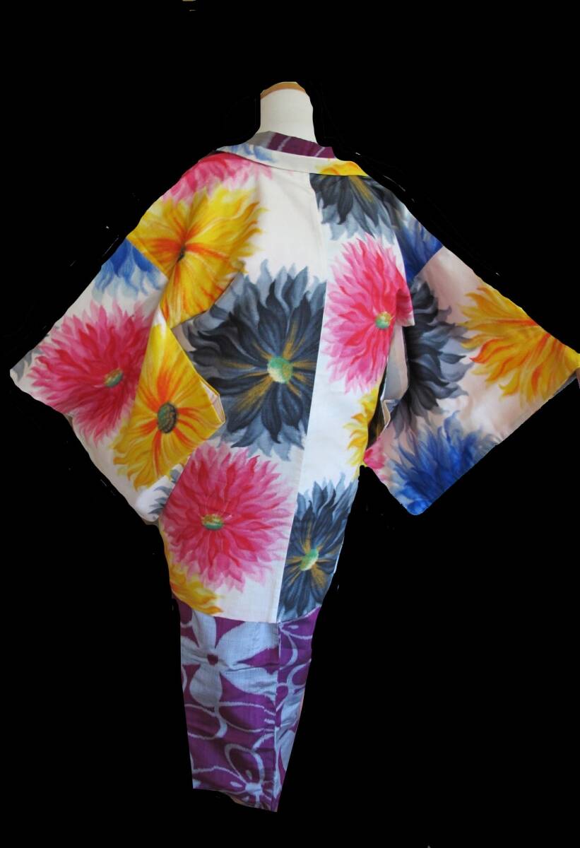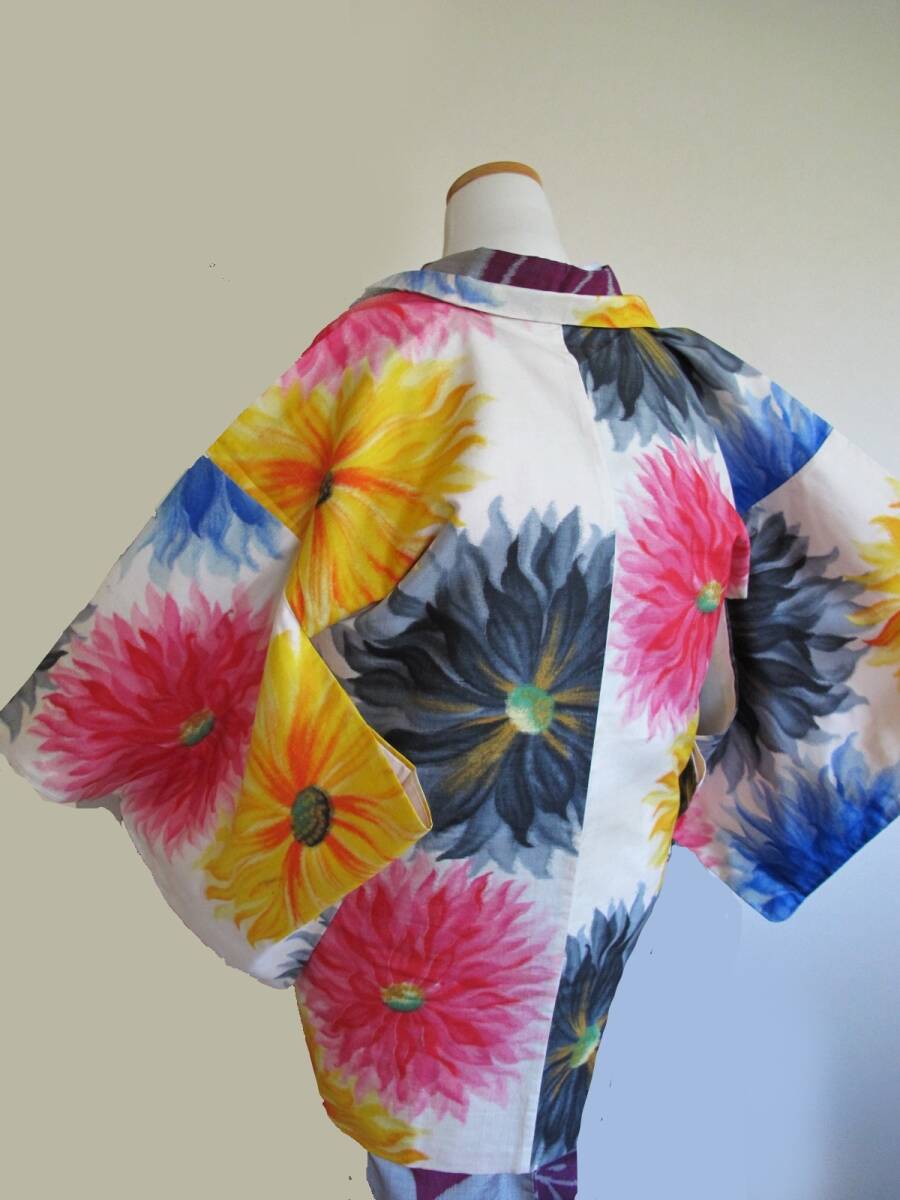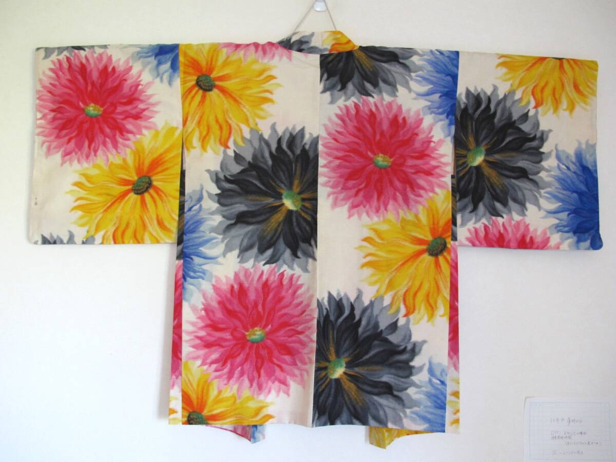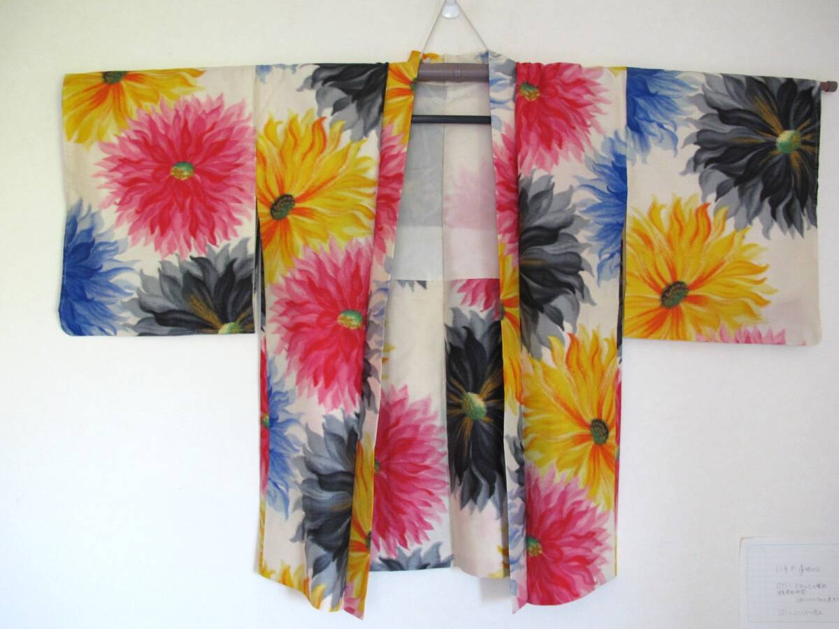 カラフルで大きなお花がとても大胆な、モダンな意匠のアンティーク銘仙羽織です。 |