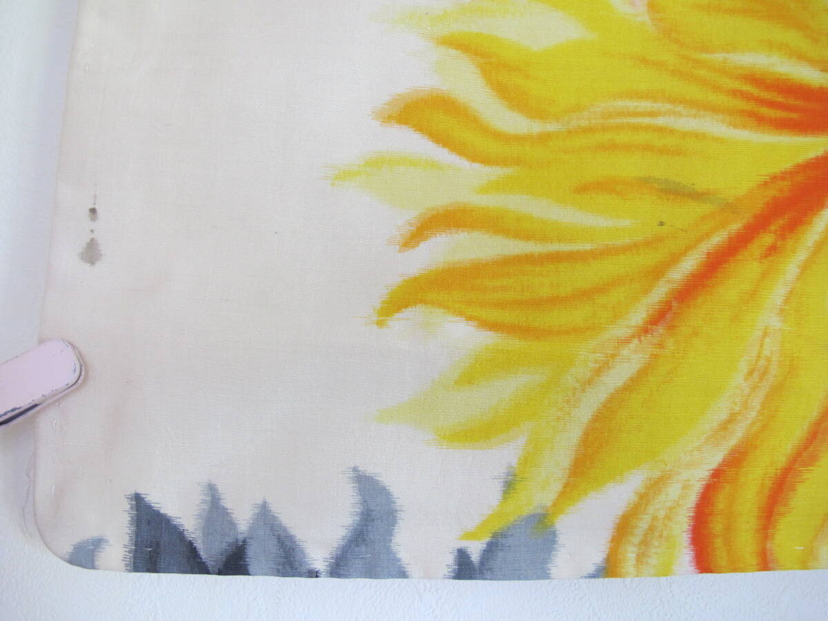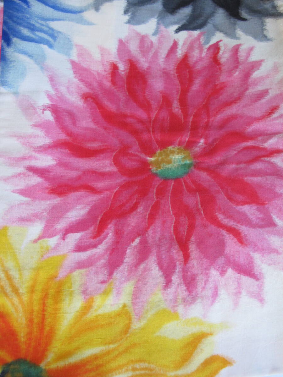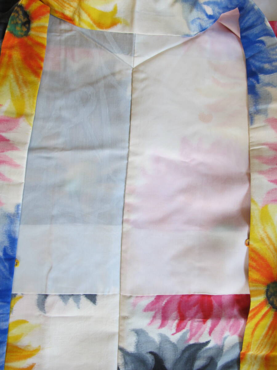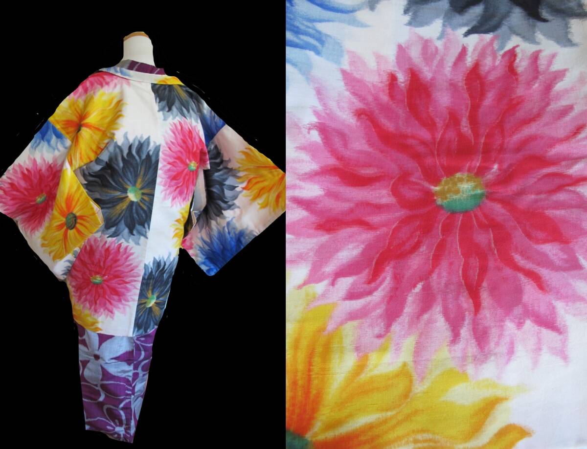 カラフルで大きなお花がとても大胆な、モダンな意匠のアンティーク銘仙羽織です。 |