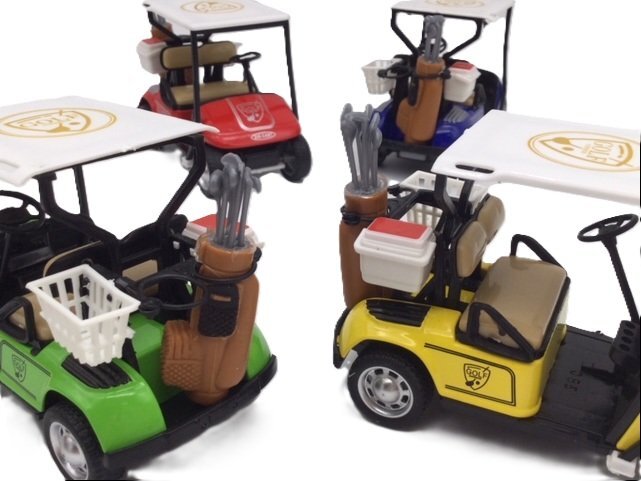 t.na社製 ゴルフカート (2人乗り) キャディバッグ(ゴルフバッグ) クーラーボックス メッシュバスケット付き ミニカー サイズ:全長約10cm ×幅約5cm ×高さ7約cm スケール的には大体1/24くらいかと思います。 メインボディはダイキャストメタル製 座席や屋根小物類、シャーシはプラスチック製 プルバック機能付きですのでチョロQみたいに走らせることができます。 キャディバッグ(ゴルフバッグ)、クーラーボックス、メッシュバスケットが付いているので 複数並べてあげると気分はゴルフ場! *こちらは箱入り商品ではございませんので、ご注意くださいませ。 4色セットの場合はサイズオーバーの為、レターパックプラスには入りませんのでご注意下さいませ。 1台1台検品し、丁寧に梱包しておりますが、 仕入れ時からのかすかな傷、汚れ、塗装ミスがある場合があります。 |