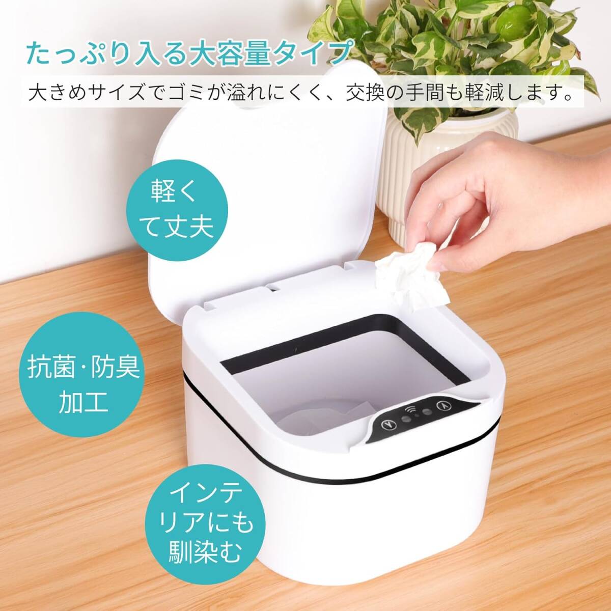 手を近づけるだけで自動でフタが開き、約5秒後に閉まる「センサー付き自動開閉」機能を搭載。反応もスピーディーで、ゴミを捨てたい瞬間にすぐ使えるストレスフリーな卓上ゴミ箱です。