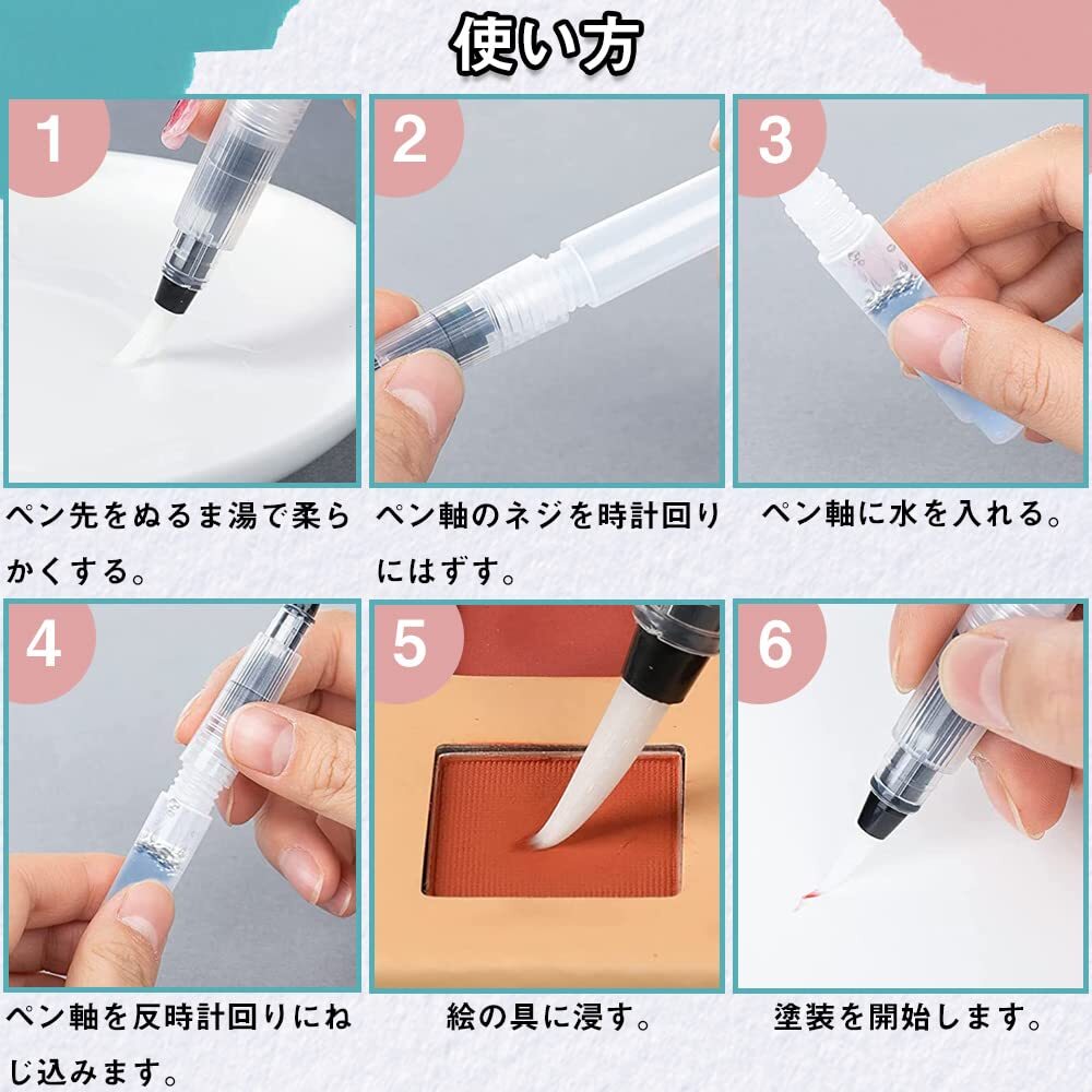 まずペン先をぬるま湯で柔らかくし、水彩ペンの本体のネジを外して水を入れ、本体を押すだけで水が流れ出てきます、絵の具に浸す。 ペン先で絵を描いたり、文字を書いたりすることができます。 操作はとても簡単で、コンパクトなデザインは持ち運びにも便利です。 ペンにはキャップが付いているので、水が出て文房具が汚れる心配もありません。