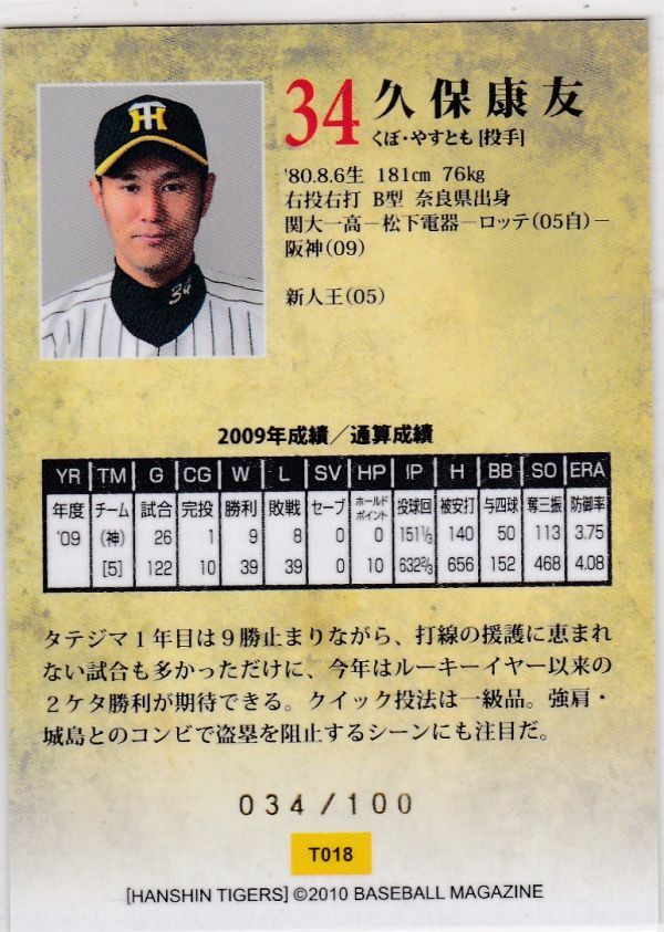 ●2010BBM/阪神 【久保 康友】 100枚限定 キラパラレル:ジャージーNo.