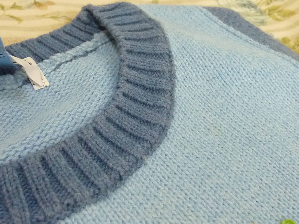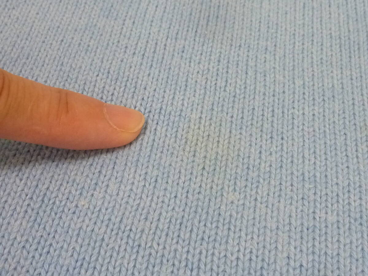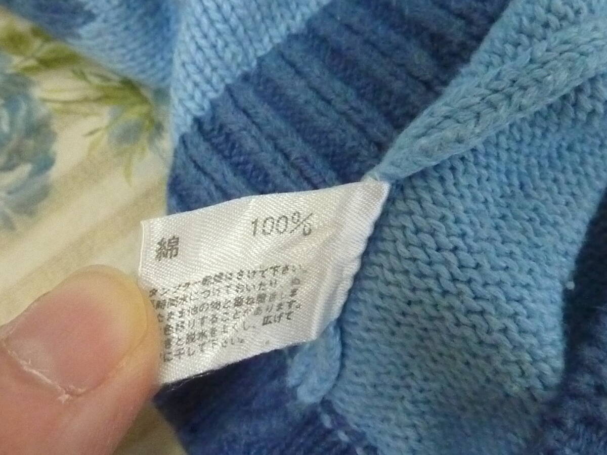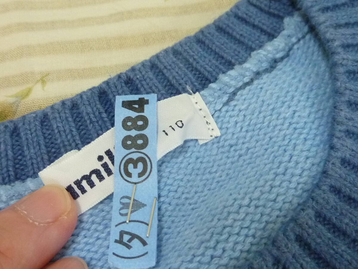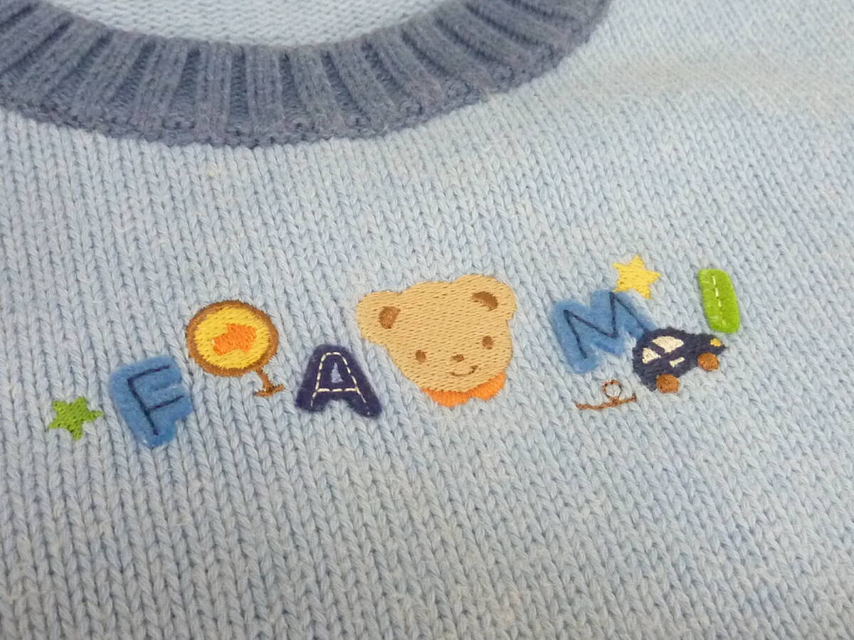 ファミリアのニットのベストです。記載サイズは110cm。着丈35㎝。クリーニング済。右裾の部分にうっすらとシミが見えます。肉眼でもちょっと見えにくいのですが、写真でご確認ください。