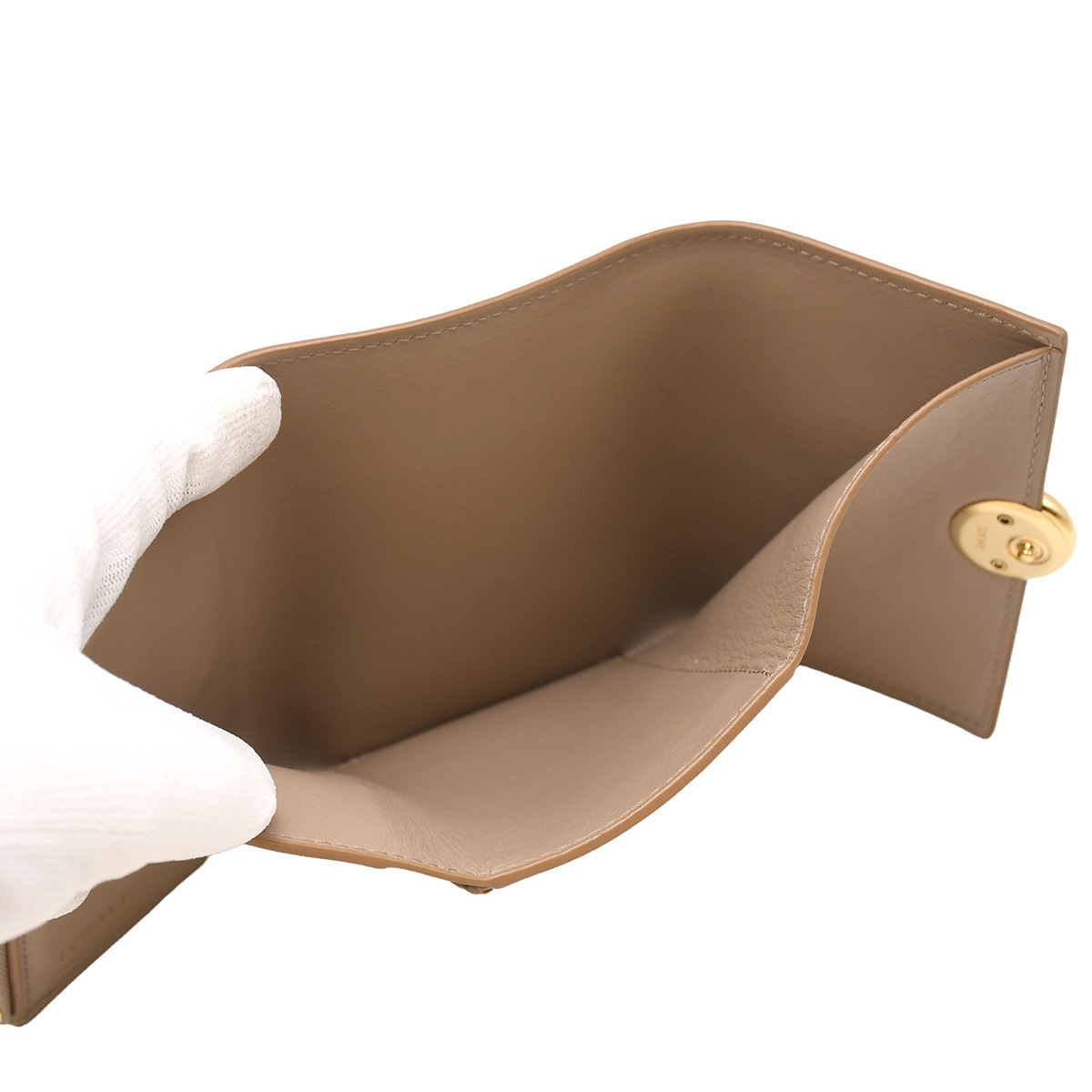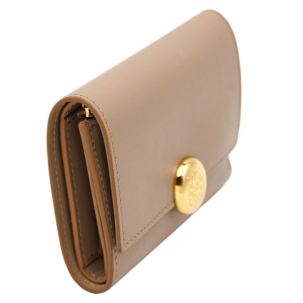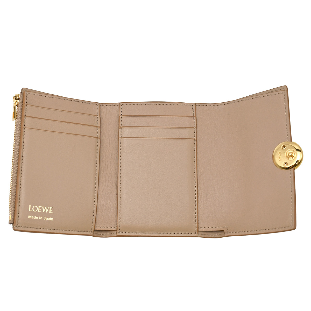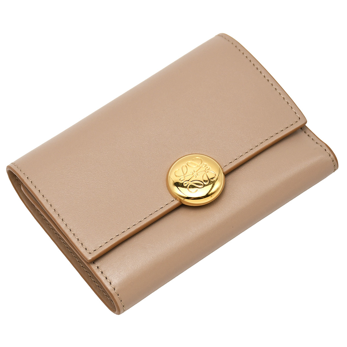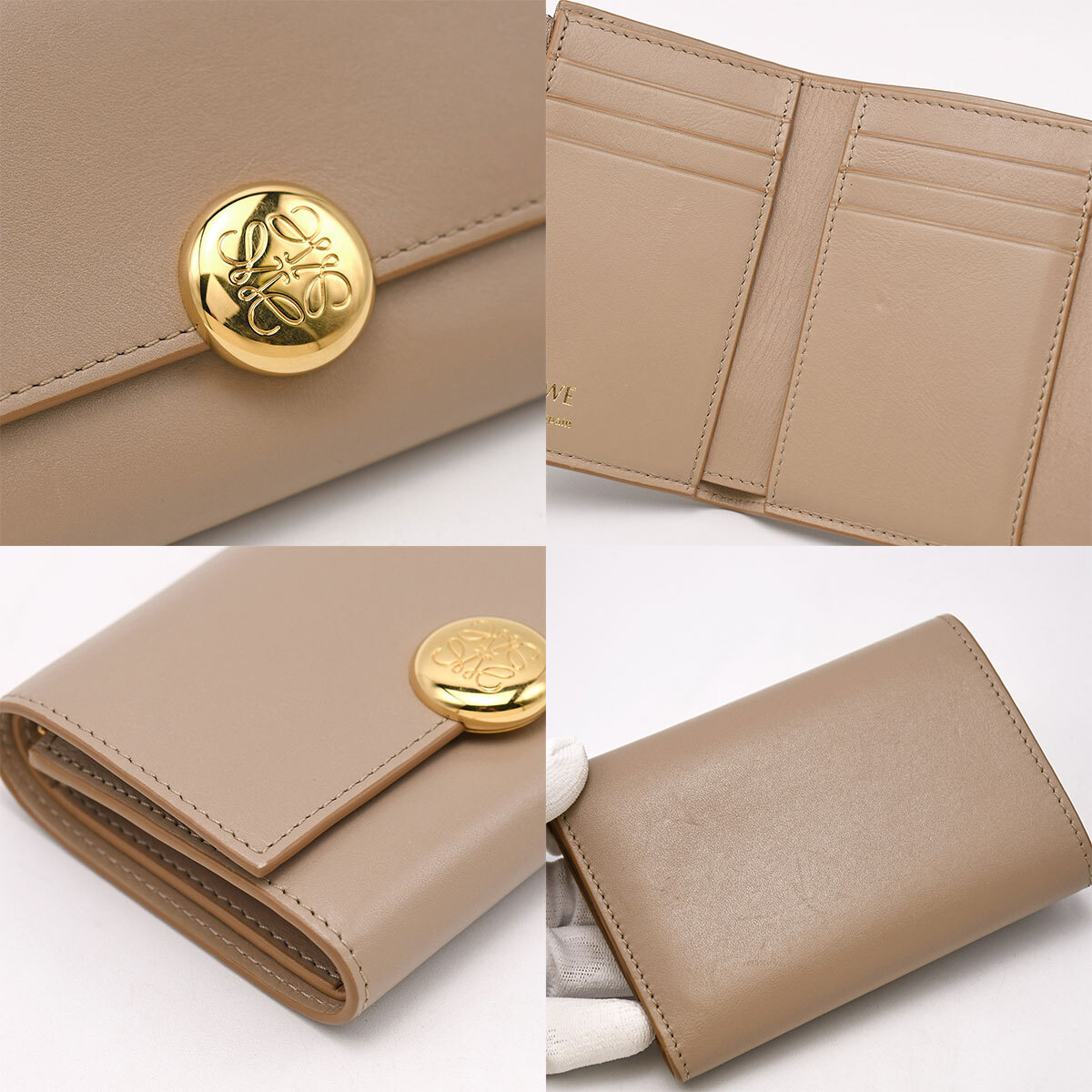 金具に若干小キズ、レザーにスレやシワ、小銭入れに若干押し跡あり。 その他特に目立つダメージはなく、まだまだ永くお使いいただけるおすすめの逸品です。 シグネチャーのアナグラムぺブルのクロージャーがあしらわれた、ロエベの三つ折り財布が入荷しました。 カードスロット6か所、ポケット2か所、小銭入れや札入れとコンパクトながら収納力は十分なアイテム。 人気のグレーベージュカラーで、幅広い世代の方におすすめの逸品です。 |