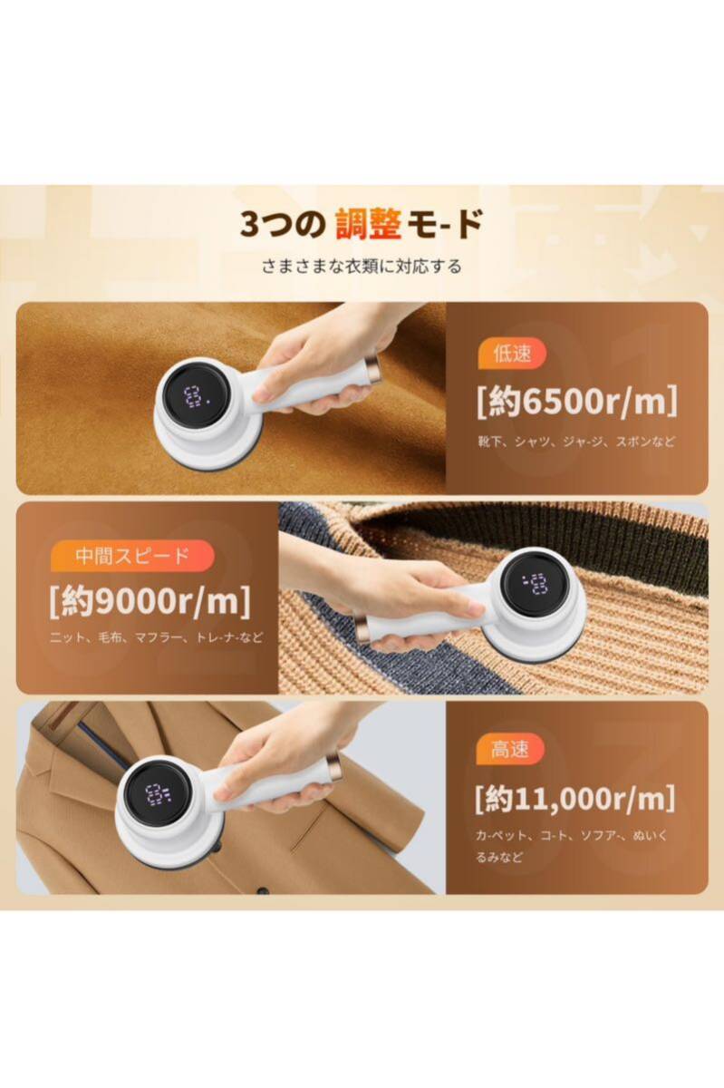 【3段階調整&テクスチャ保護です】毛玉取り機のステンレスネットには3種類の穴があり、様々なサイズの毛玉を衣類を傷めることなく簡単に取り除くことができます。ボタン一つで3段階に調節可能:ロー、中、ハイの3段階です。振動刃を採用しているため、使用時に傷がつくことはありません。生地を保護しながら余分な毛玉を除去することができ、織物を傷めることはありません。