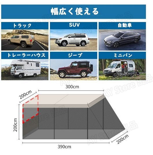 カーサイドタープ 車用タープテント トランクテント 車と連結 4-8人用 カーオーニングサンシェルター 簡単設置 キャンプ 通気性 bhw0099.3