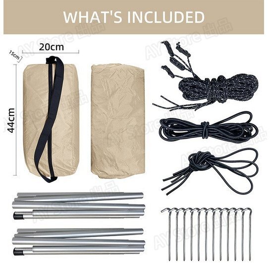 付属品:テント本体、ペグ*12、ロープ*9、スタンド*2、収納袋×1
