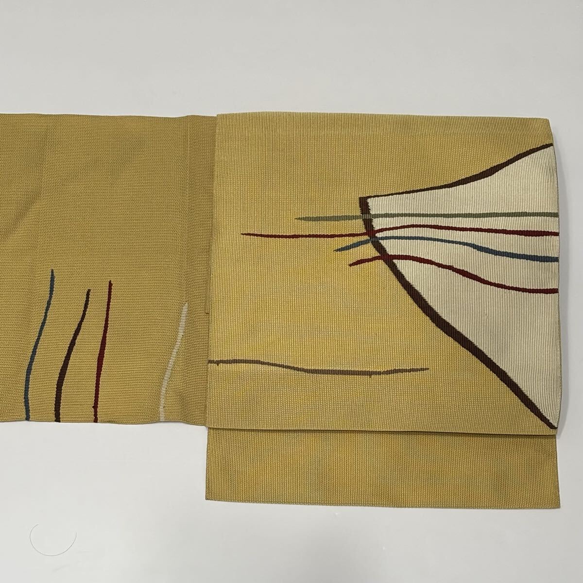 芥子色地に抽象柄をあしらった、目を引くデザインの名古屋帯です。