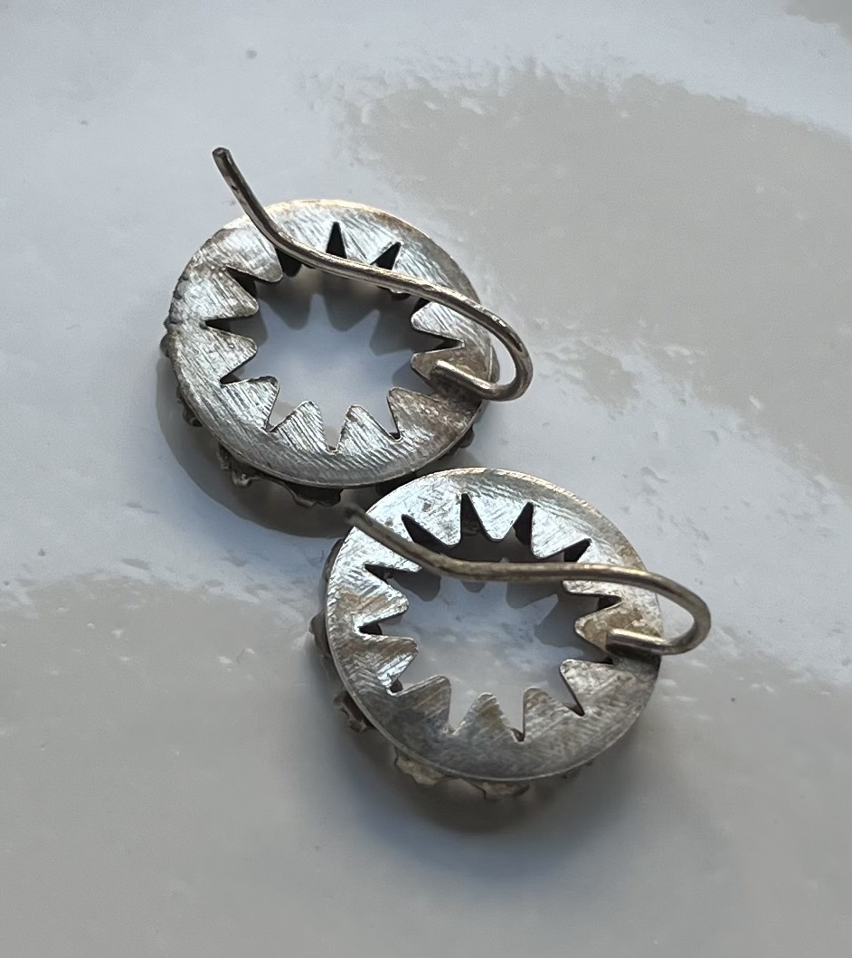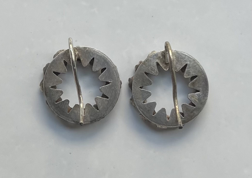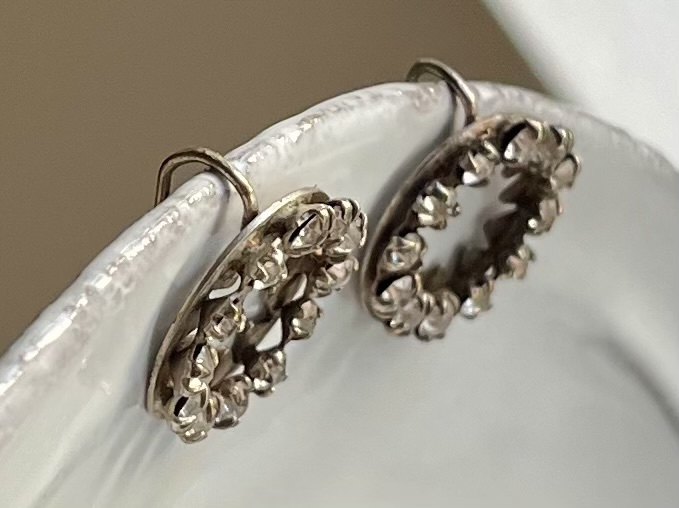 シルバー金具にクリアのラインストーンがサークル状にあしらわれていて、着用すると耳たぶにピタッとつく感じになり着けやすいピアスです。