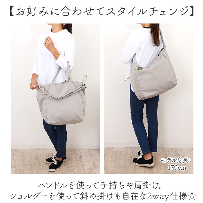 | 商品説明 | ・・【お出かけの際に頼れる相棒】 ・サッと持ち出せて収納力も抜群◎「シャーリングショルダー2WAYビッグトート」。 ・【くしゅっと可愛いシャーリング♪】 ・ショルダーをのコードを引っ張って結ぶと、くしゅっと感をプラス。ちょっとしたアクセントに! ・【お好みに合わせてスタイルチェンジ】 ・ハンドルを使って手持ちや肩掛け。ショルダーを使って斜め掛けも自在な2way仕様☆ ・【軽やかな使い心地でストレスフリー】 ・体に負担がかかりにくい軽量設計。長時間持ってても疲れにくく、移動もラクラク。 ・【マグネット式でワンタッチ開閉】 ・開口部は力いらずで簡単◎大きく開いて出し入れしやすく、閉じれば中身の飛び出しもガード。 ・【B4対応◎たっぷり入る大容量】 ・B4が収まり、マチもしっかり設けたビッグサイズ。荷物がざっくりひとまとめ。 ・(※)A3も収まるサイズ感ですが、フォルムが崩れたり角が折れてしまう可能性があります。 ・【サクッと取り出せて迷子知らず】 ・内側に吊りポケットを1つ配置。細々した物も、バッグの中で探す手間が不要。 ・【色んなシーンで使えて万能】 ・マザーズバッグやお買い物バッグ、ジムやヨガ、ランドリー。旅行などにもおすすめ。 ・【使い方次第でユニセックス仕様に】 ・シャーリングを付けない状態では、シンプルなトート。性別問わず使えるのも嬉しい! ・【ポケット仕様】 ・内側:吊りポケット×1 |