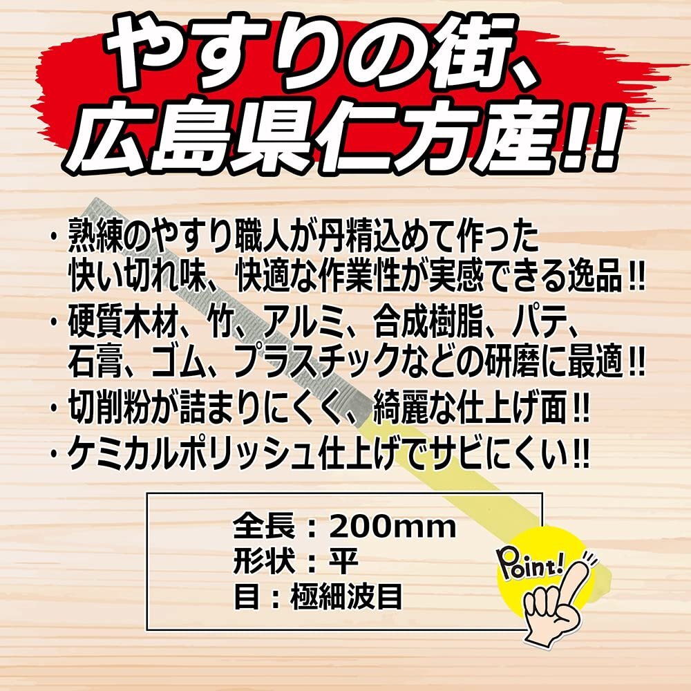 ブランド:SK11(エスケー11)熟練のやすり職人が丹精込めて作っているため、快い切れ味、快適な作業性が実感できる【用途】硬質木材、竹、アルミ、合成樹脂、パテ、、プラスチック、石膏、ゴムなどの研磨作業【特徴】・切削粉が詰まりにくく、綺麗な仕上げ面・やすりの街、広島県仁方産・ケミカルポリッシュ仕上げでサビにくく、きれいな仕上げ面【注意事項】※ヤスリ本体にカケ・ヒビ・ワレ・亀裂がないことを確認して下さい。※逆方向に使用すると目を傷めて寿命を短くします。※ヤスリをハンマー代りに使用して加工物を叩かないで下さい。※折れる恐れがありますので、ヤスリをテコ代りに使用しないで下さい。※作業時には、手袋、作業メガネなどの着用をお勧めします。用途:硬質木材、竹、アルミ、合成樹脂、パテ、、プラスチック、石膏、ゴムなどの研磨作業