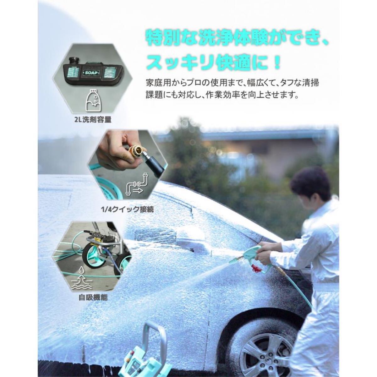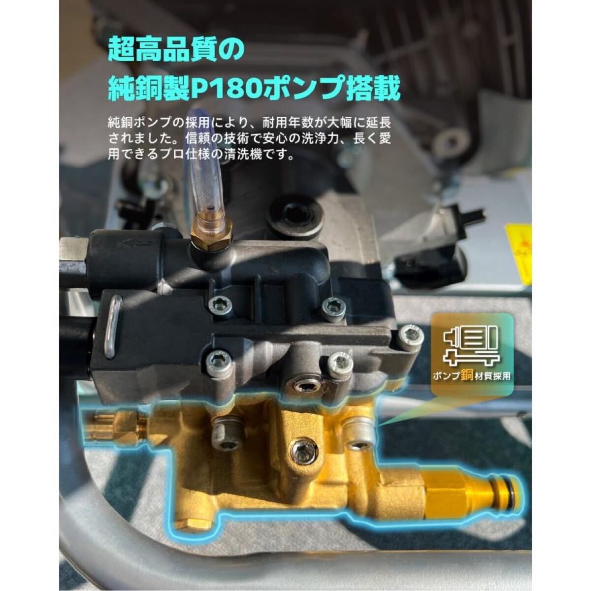 P180純銅製高圧ポンプ搭載し9.5L/min流量で自吸機能はもっと安定しています。フィルター付いて海水や川の水なども洗えます。水道への直結も可能。2L洗剤注入用オプションタンク搭載一般的な洗浄場合には満足しています。
