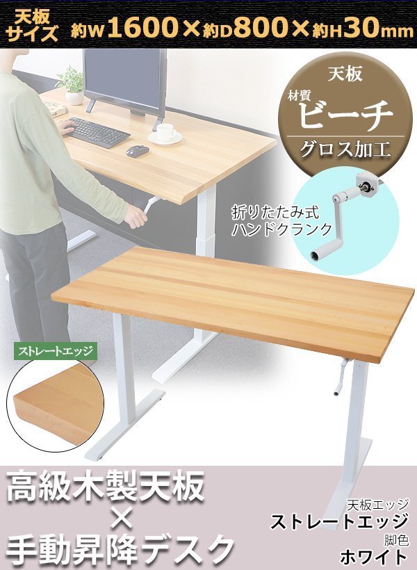 | 商品名 | 送料無料 昇降デスク 手動 W1600×D800×H735~1185mm ビーチ材 高級 木製 天板 グロス加工 耐荷重約70kg(脚部) スタンディングデスク 上下昇降 デスク 手動昇降 上下昇降 昇降デスク 高さ 調整 オフィスデスク 昇降式デスク 昇降テーブル 昇降式テーブル ストレートエッジ 脚色 ホワイト hk01160beechg |
