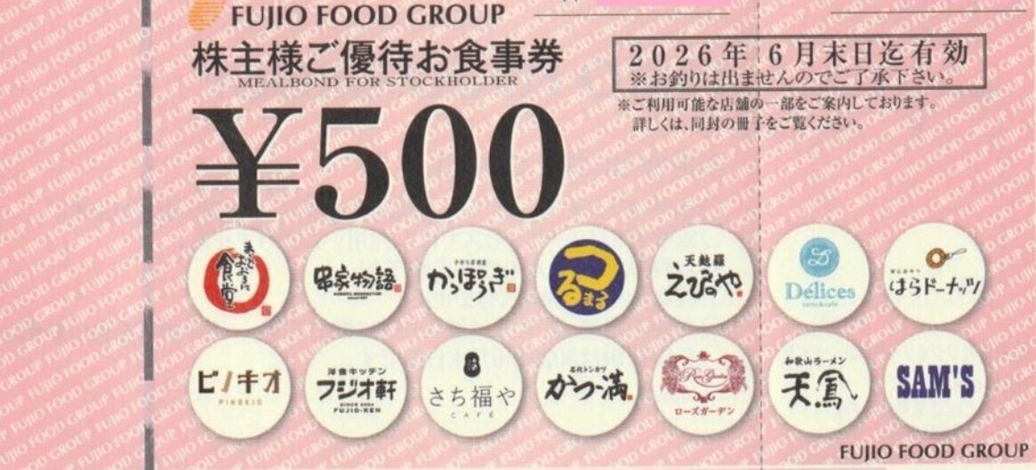 | 商品説明 | 皆様はじめまして! このたびは当出品ページをご覧いただき誠にありがとうございます! 【商品内容】 最新のフジオフードの株主優待券 15,000円分 (500円×30枚) です。 ★ゆうパケットポストminiで送料無料で配送いたします。 ◎有効期限は、≪来年≫令和8年6月末日まで です。 ◎主なブランドは、まいどおおきに食堂・さち福や・串家物語・つるまる・かっぽうぎ・天麩羅えびのや・ピノキオ・デリス・フジオ軒・ かつ満・和歌山ラーメン天鳳・はらドーナッツ・ローズガーデン・SAM'S 等 があります。 ◎優待券の詳細に関しては↓↓↓にてご確認ください。 https://fujiogroup.com/ir/hospitality.html |