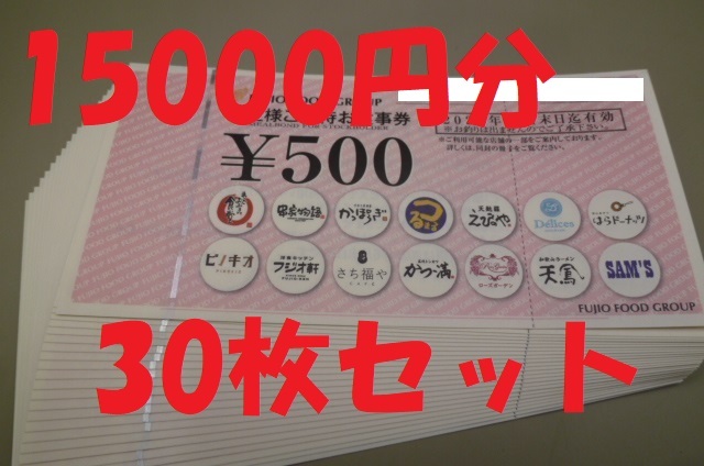| 15000円分 フジオフード 株主優待券 30枚 食事券 串家物語 まいどおおきに食堂 はらドーナッツ つるまる さち福や えびのや | |