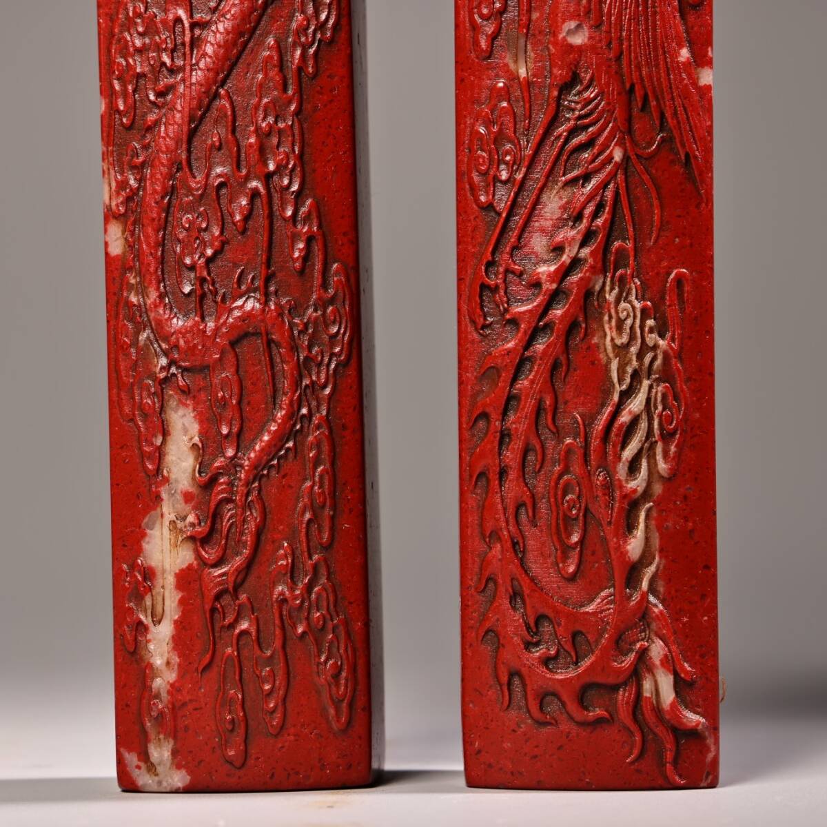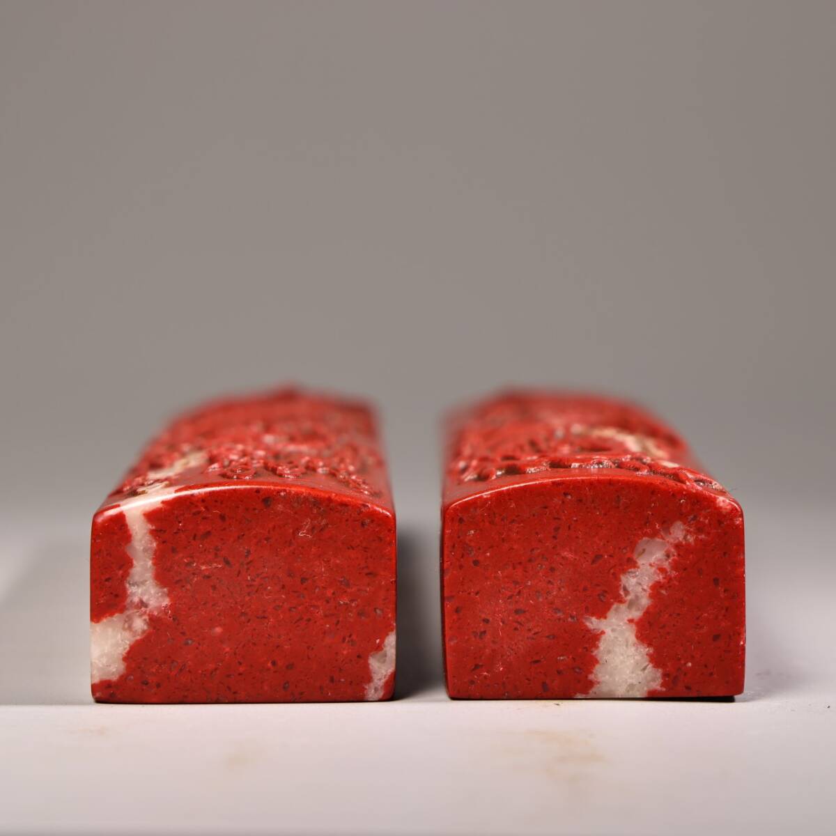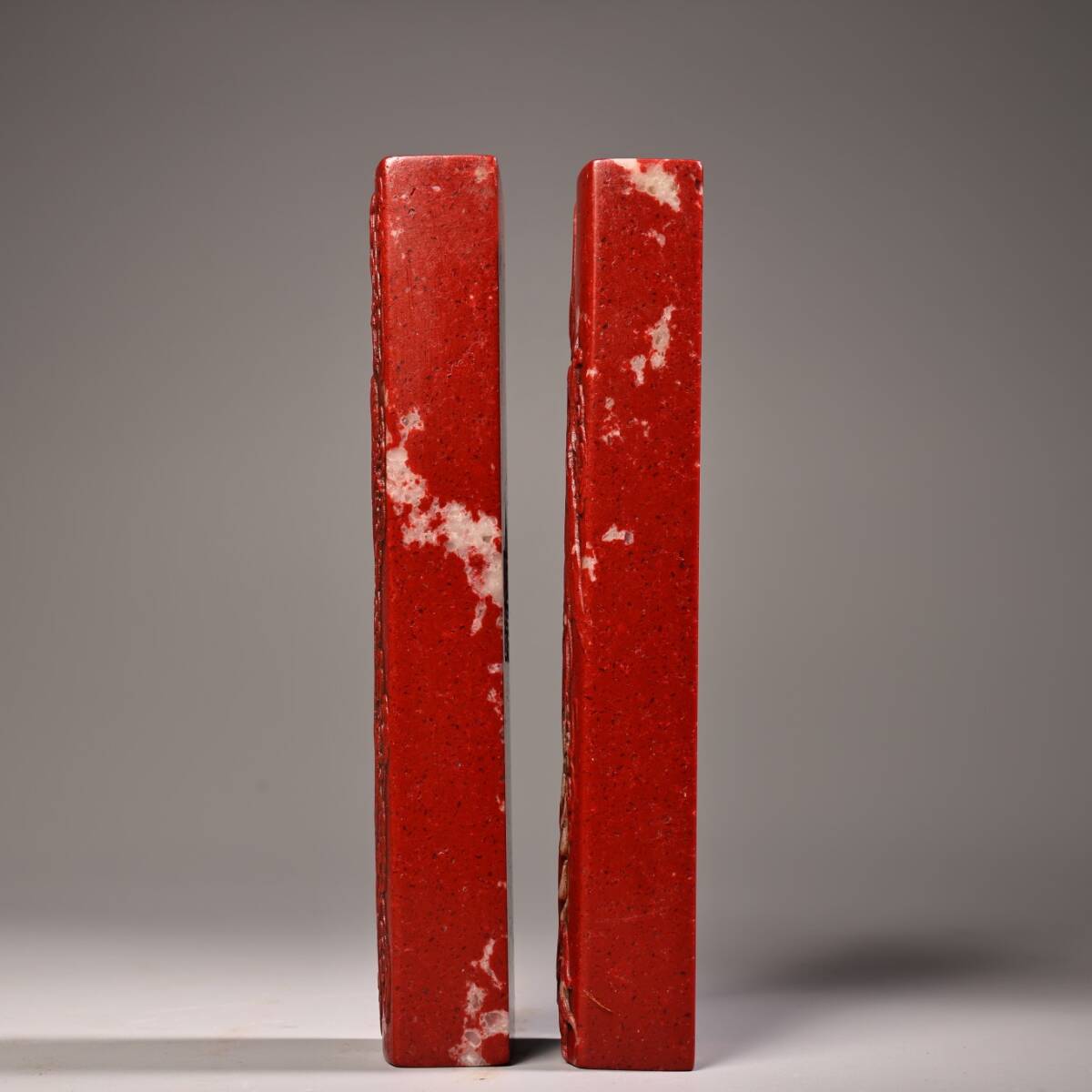 *珍品旧蔵* 清 鶏血石 大紅袍 高浮彫 鎮尺一対 天然石 手彫 篆刻 極細工 唐物 中国古玩 骨董品 古美味 H48