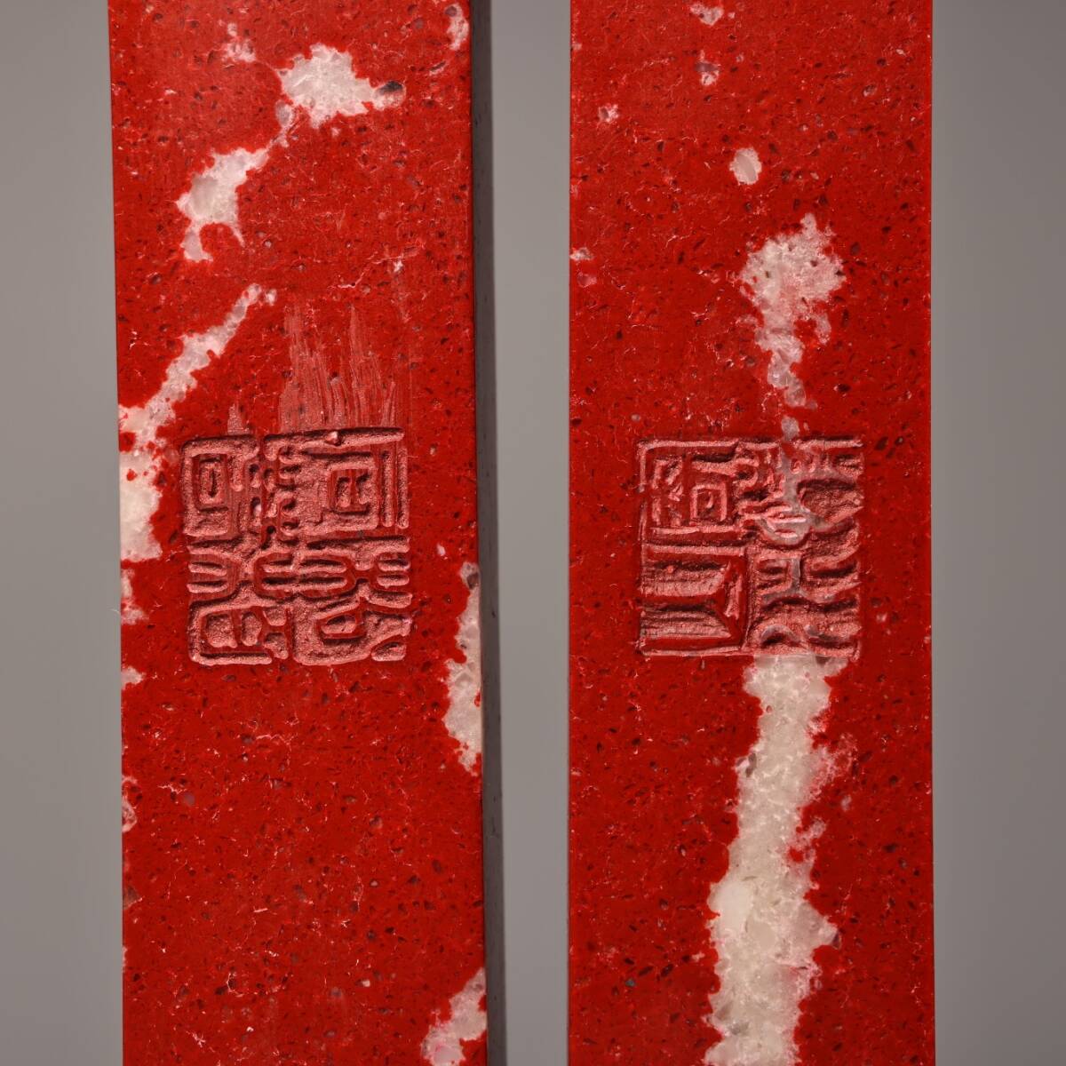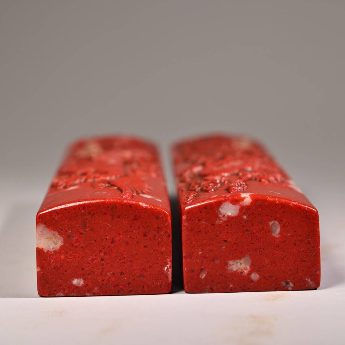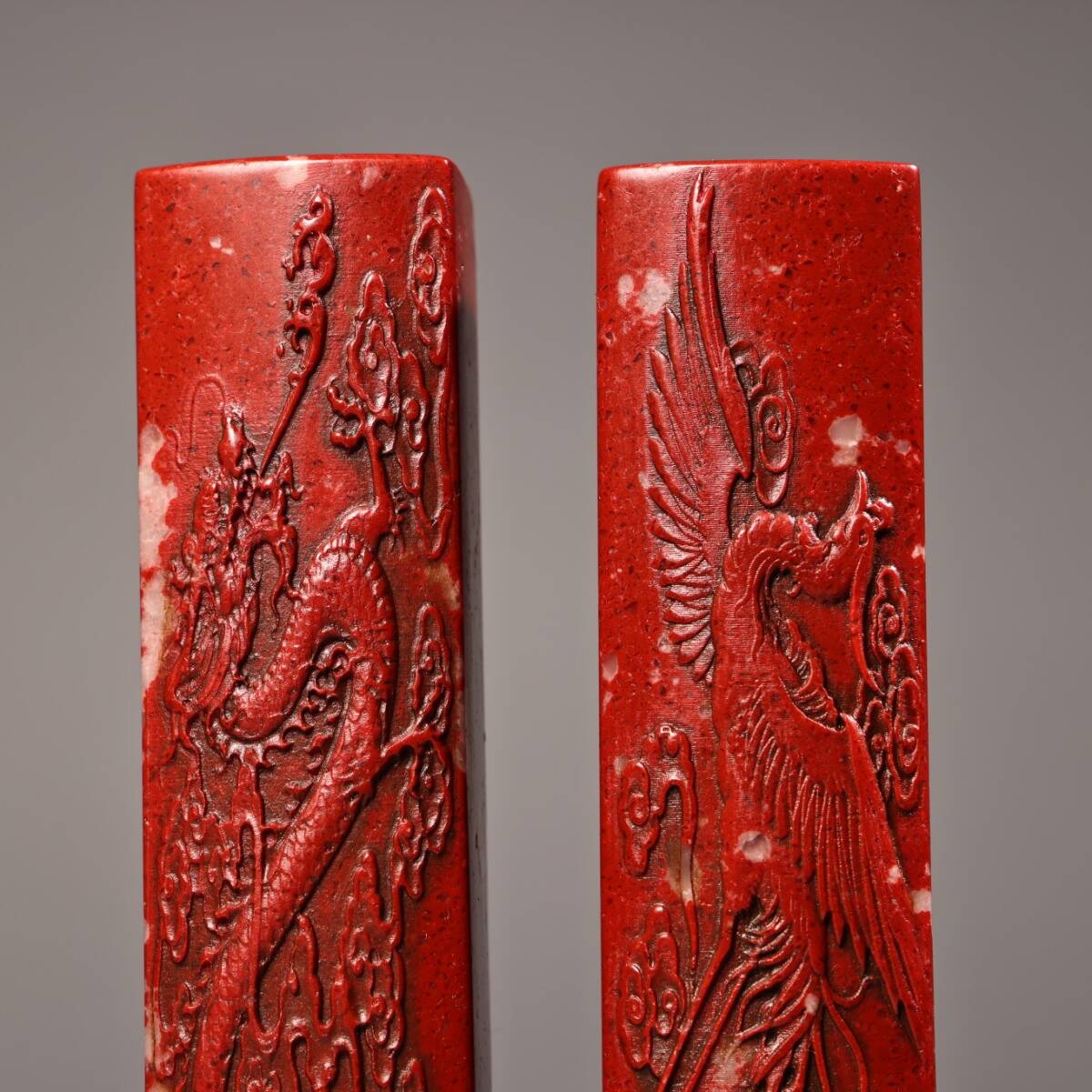 *珍品旧蔵* 清 鶏血石 大紅袍 高浮彫 鎮尺一対 天然石 手彫 篆刻 極細工 唐物 中国古玩 骨董品 古美味 H48