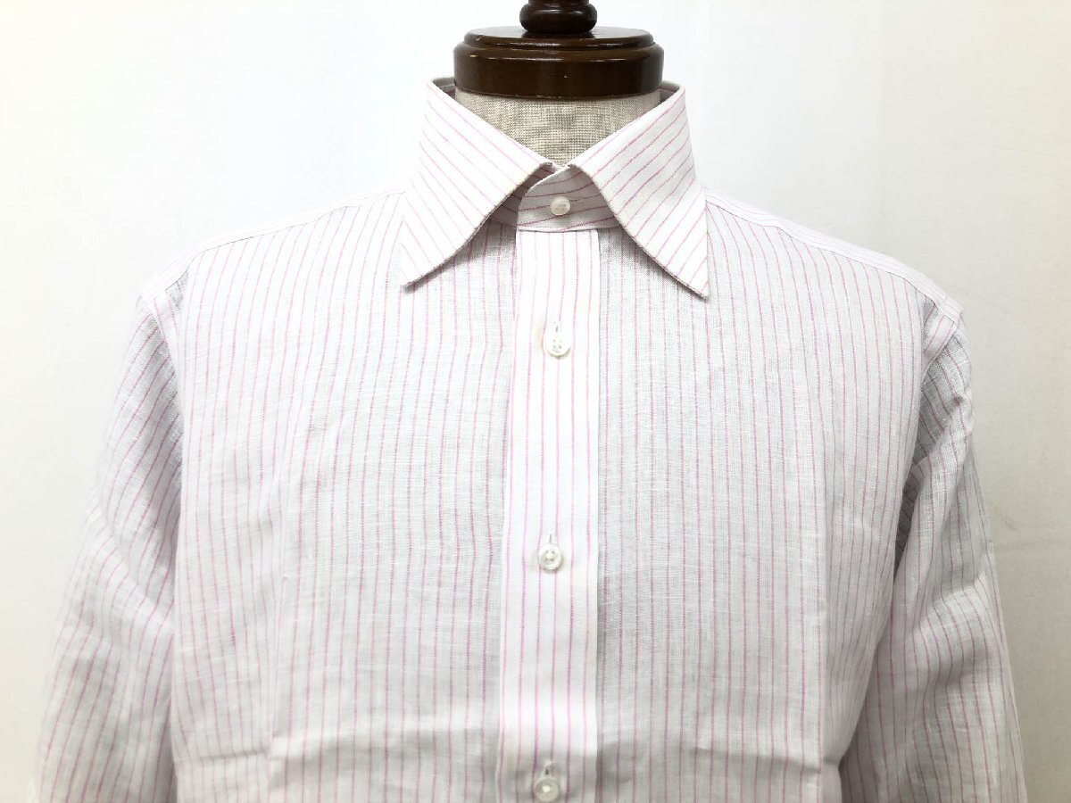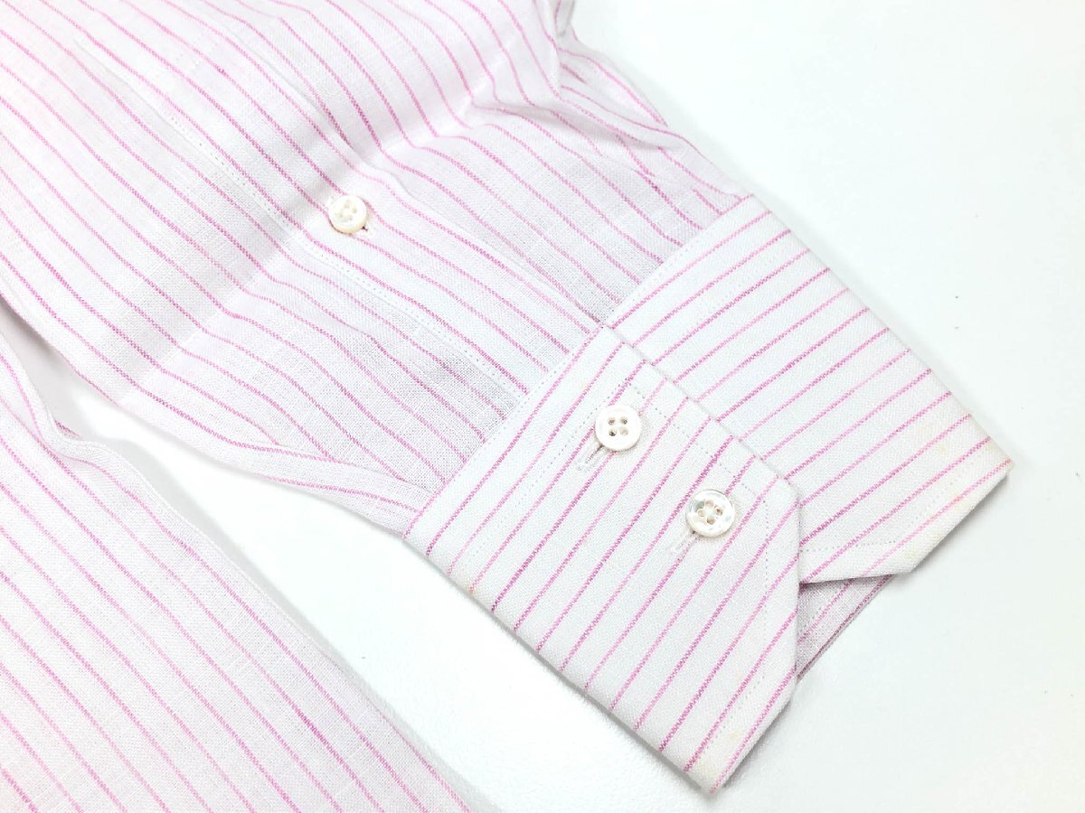 【麻布テーラー azabu tailor】リネン100% ストライプ柄 ワイドカラー 長袖シャツ (メンズ) sizeL相当 ホワイト×ピンク系 ◇35MK5893◇