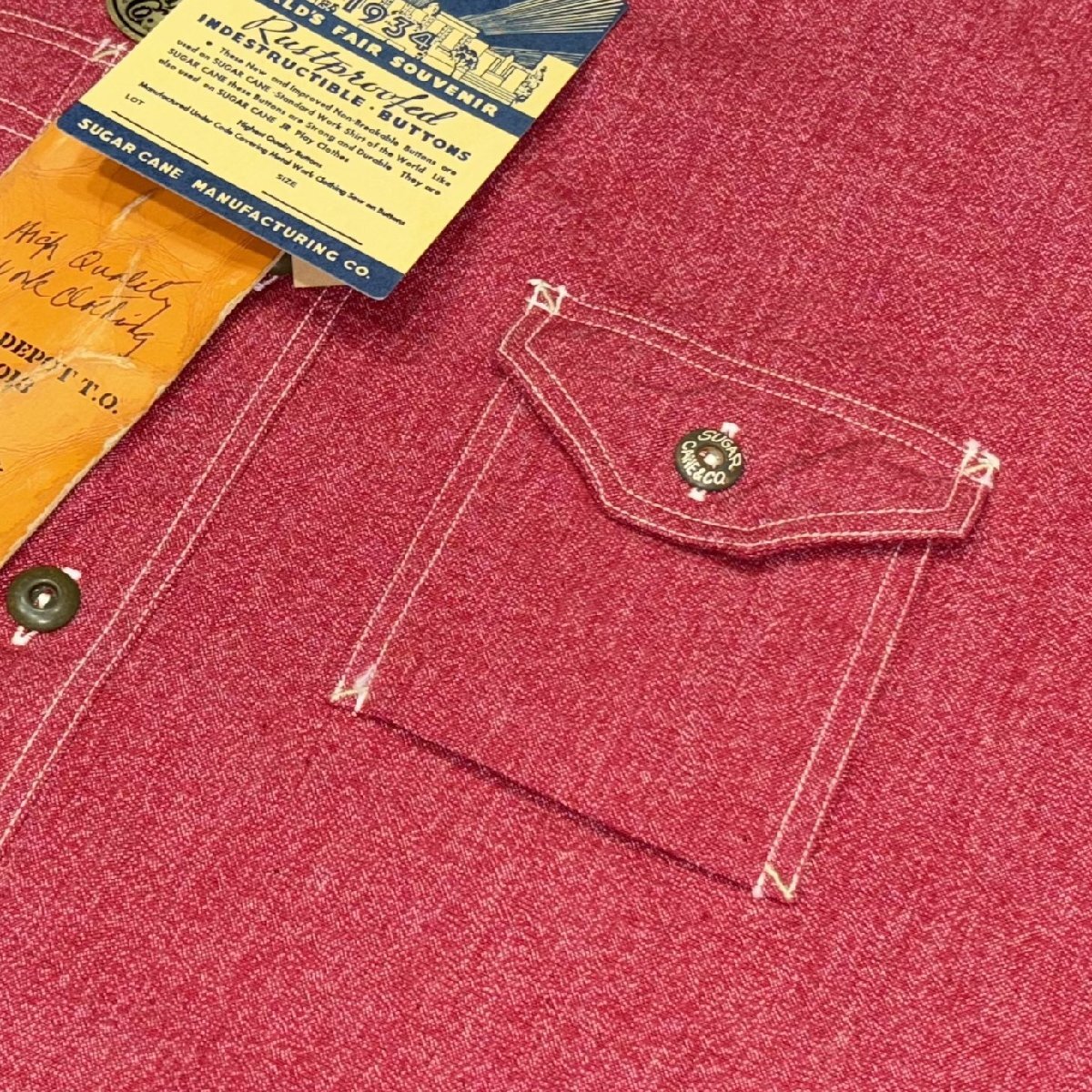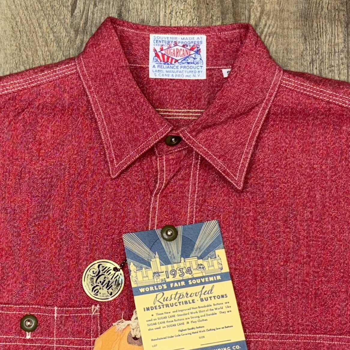1933~1934年に開催されたシカゴ万博にて、シュガーケーンが参加していたら出品していたであろうと想定したワークシャツを製作。シャトル織機で織り上げた耳付きの杢生地やガチャポケ、85年の年月の経過により錆止めが剥がれ、錆びたボタン等、見どころ満載のシャツに仕上がった。