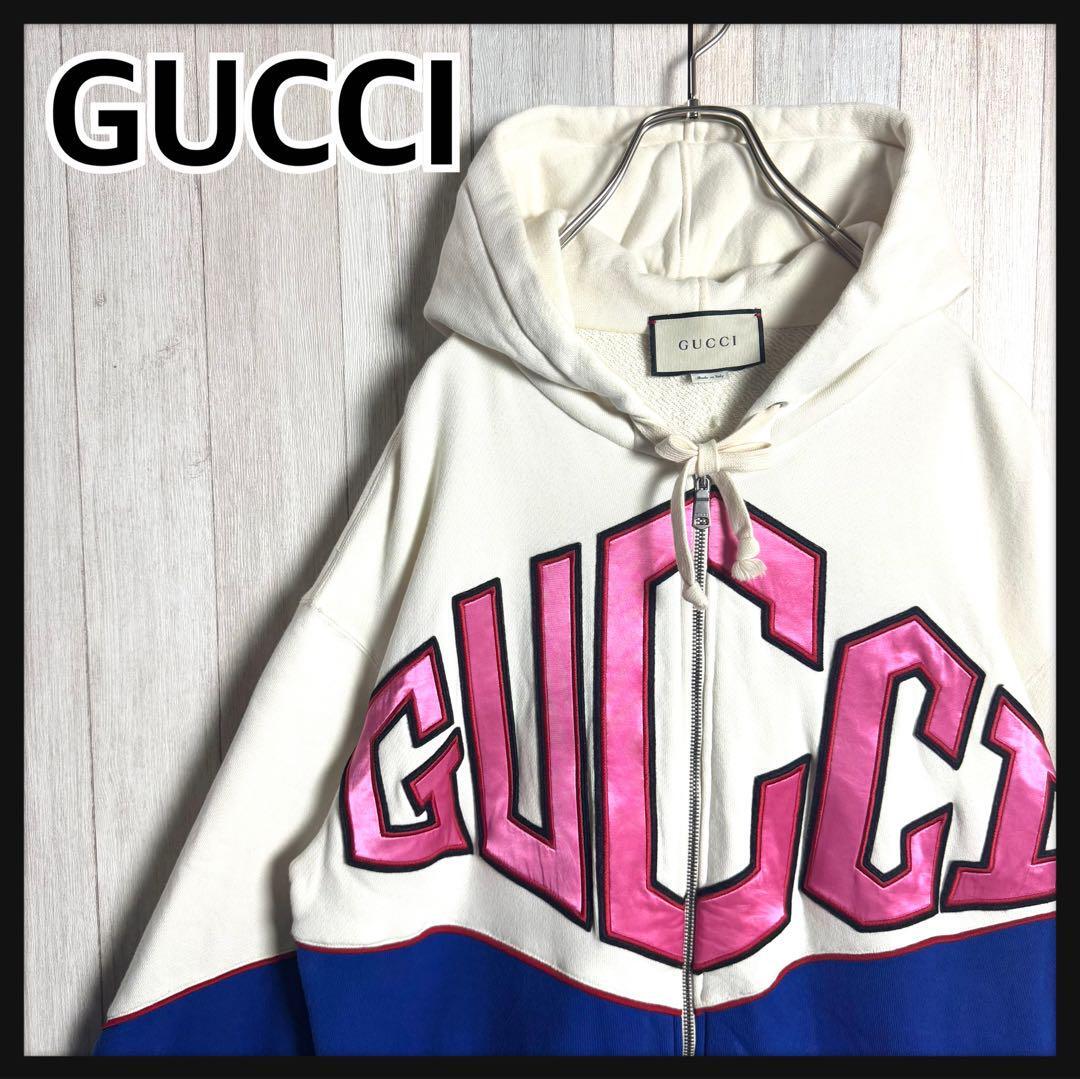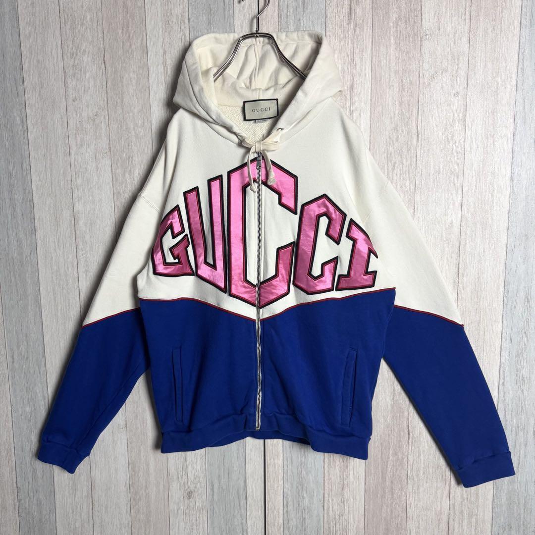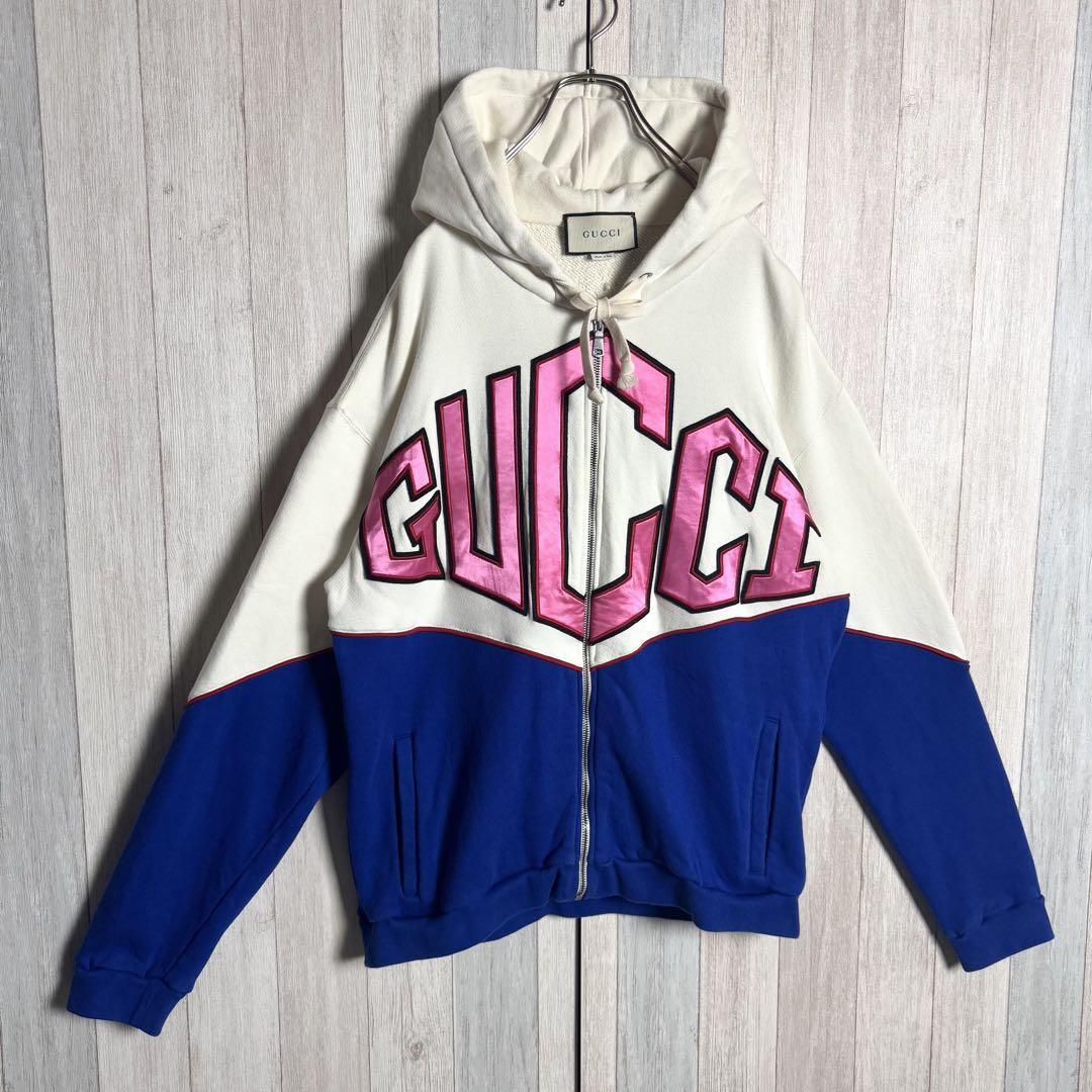 【希少デザイン・美品】イタリア製 GUCCI グッチ 刺繍ビッグロゴ オーバーサイズ ジップアップ スウェット パーカー マルチカラー M