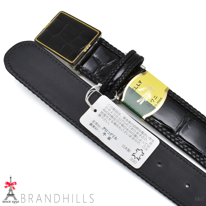 クロコダイル ベルト メンズ ブラック シャイニング加工 紳士用 幅35ミリ ピンバックル式 革編み縁取り 裏:牛革 日本製 新品
