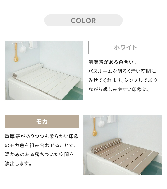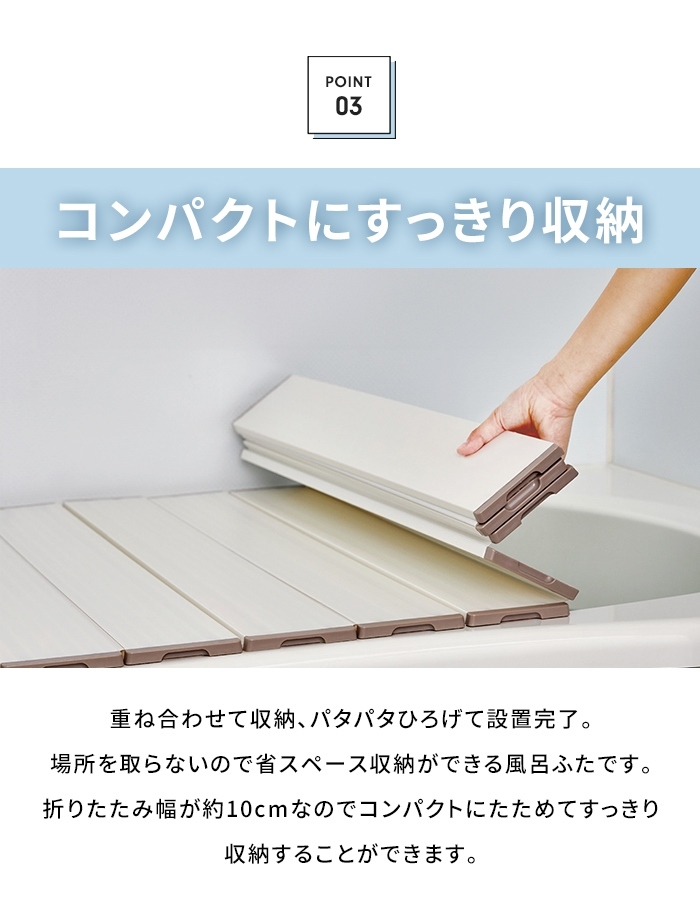 | Ag抗菌折りたたみ式 風呂ふた。 〔POINT〕Ag抗菌加工&防カビ加工 繋ぎ目にAg+銀イオン抗菌加工が施してあり、菌やカビによる嫌なヌメリの繁殖を抑えて風呂ふたをきれいに保ちます。 〔POINT〕フラットな形状でお風呂掃除が簡単 表面・裏面がフラットな形状で軽く洗って水を流せばお掃除完了。 (風呂ふたを洗う際は柔らかいスポンジや中性浴室用洗剤を使用してください。) 〔POINT〕コンパクトにたためてすっきり収納 折りたたみ幅約10センチと場所を取らなず省スペースで収納OK。 パタパタ広げて設置、重ね合わせて収納完了。 〔POINT〕軽量設計 毎日使うものだから軽量でストレスフリーな使い心地。 軽量なのでお子様からお年寄りの方でも簡単に扱えます。 〔POINT〕安心・安全の日本製 【使用上のご注意】 ◎購入直後は折りたたみクセが残っていることがありますが、徐々に解消していきます。 ◎24時間風呂ではご使用をお避け下さい。 ◎風呂水洗浄剤(塩素殺菌剤)をご使用しないでください。 ◎柑橘類(柚子・みかん・レモンなど)を使用しますと風呂ふたを傷める恐れがあります。 ◎ベビーバスなどを風呂ふたに乗せて使用しないでください。 |