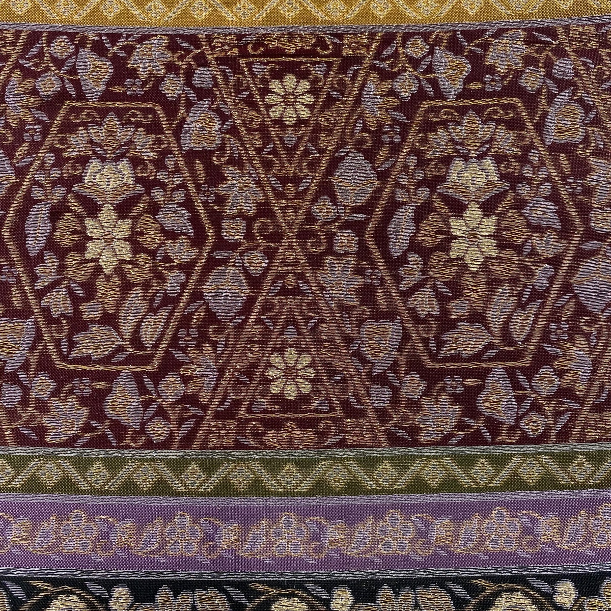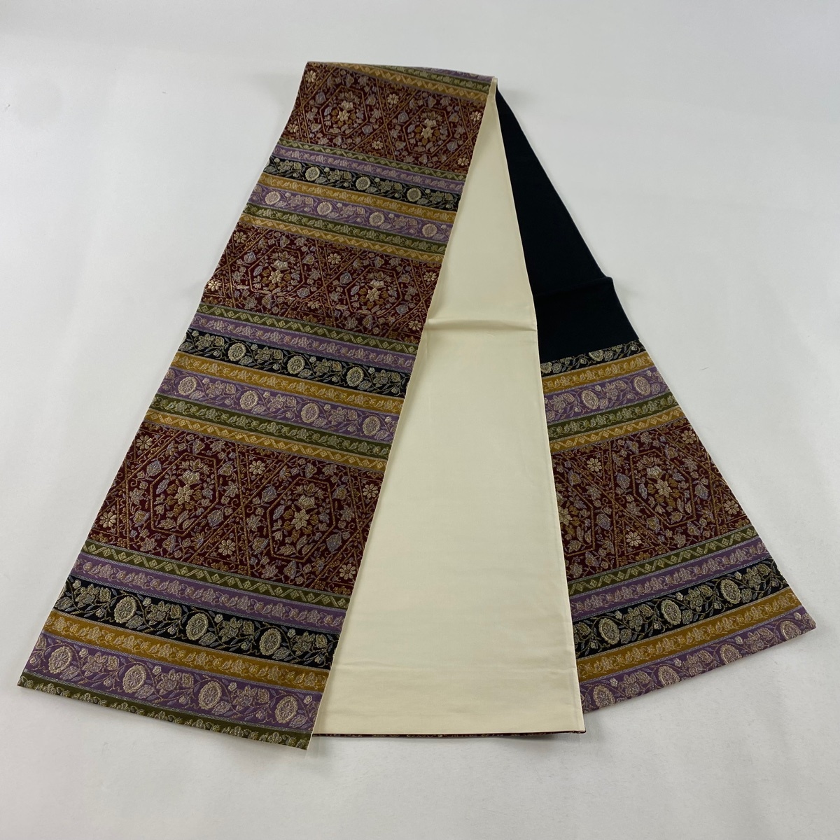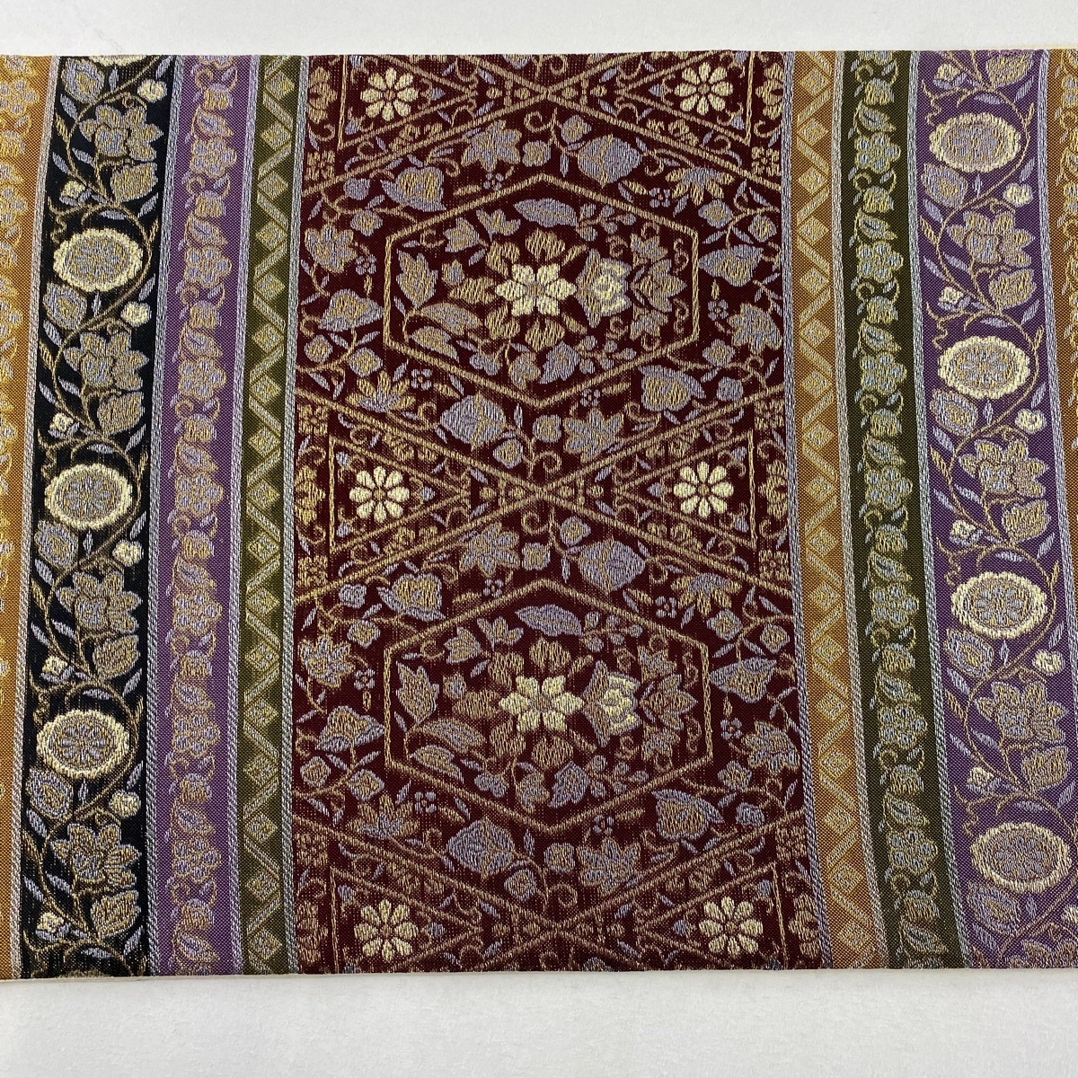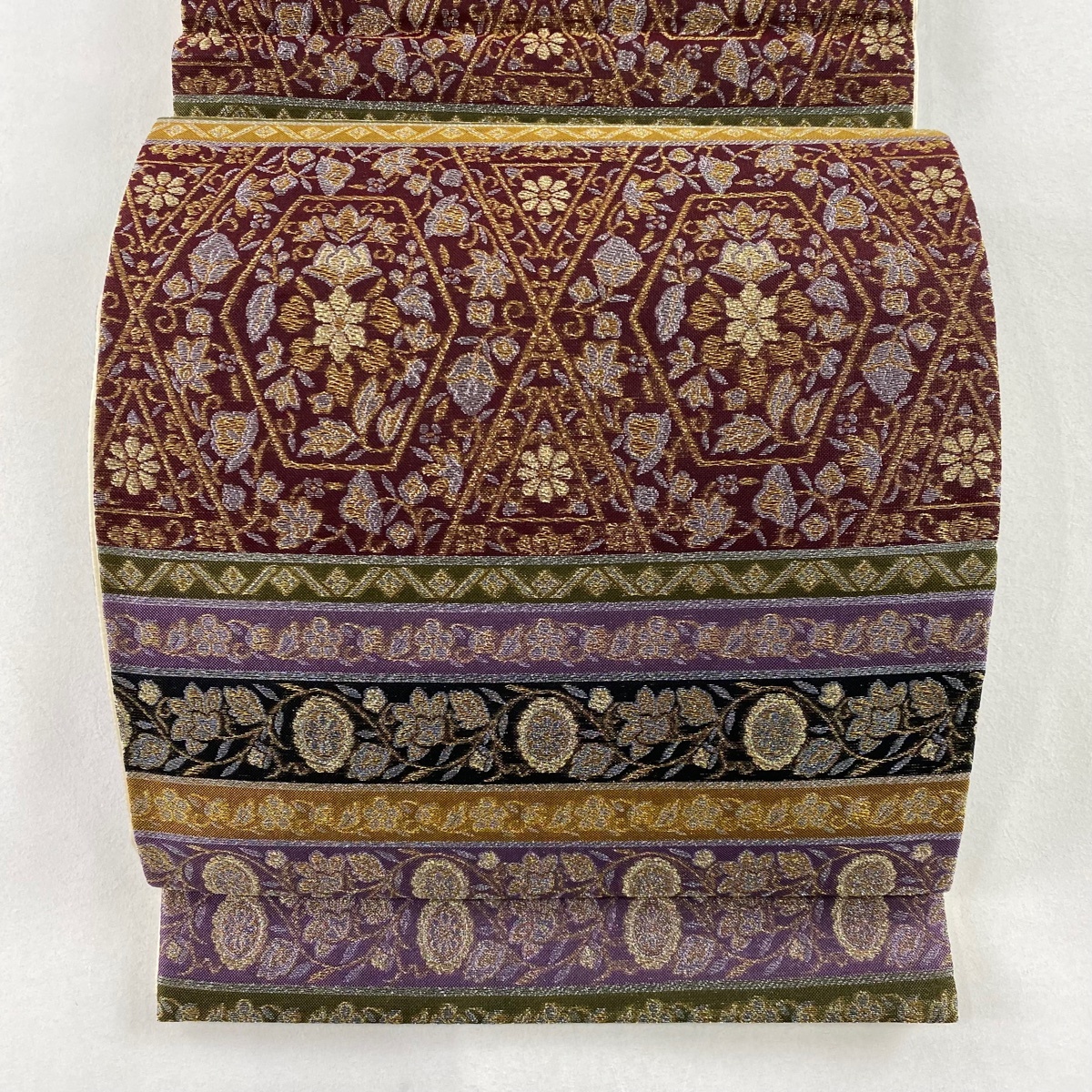 | 袋帯 美品 秀品 横段 草花 金銀糸 えんじ色 六通 正絹 【中古】 |