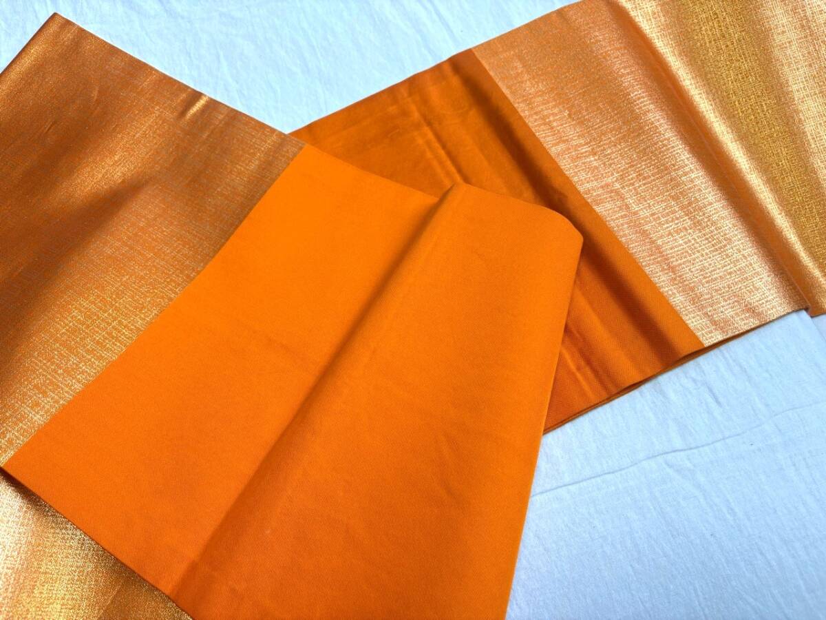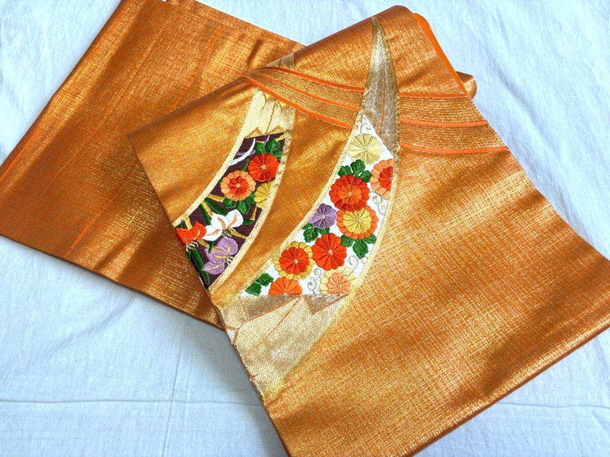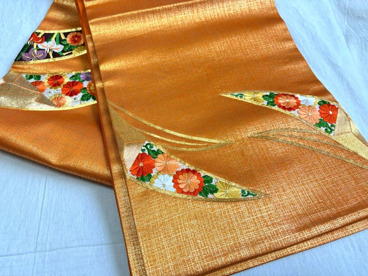 0010★名古屋帯*オレンジ*刺繍*開き仕立て*単衣*柄*着物*和服*和装*レトロ*アンティーク*女性*レディース*お得★