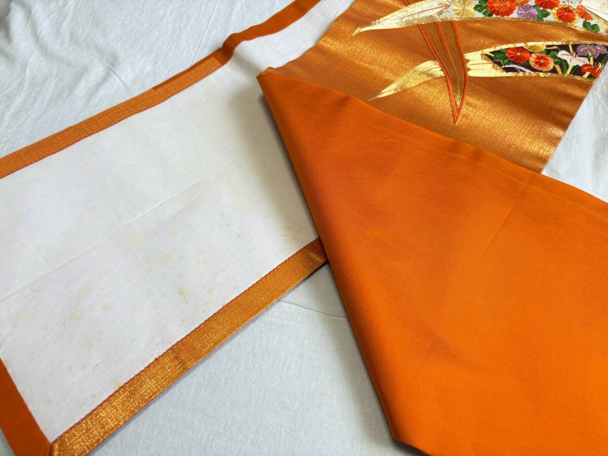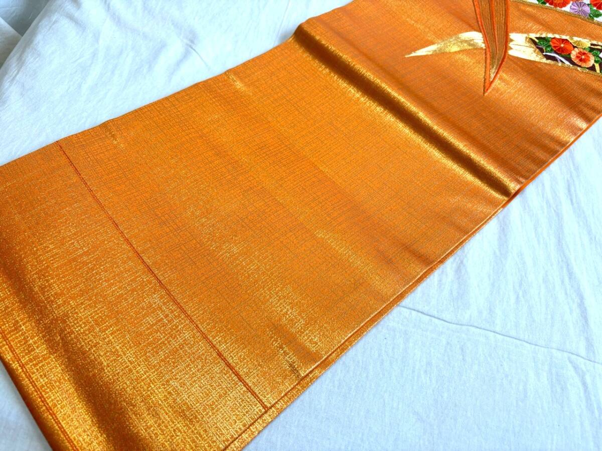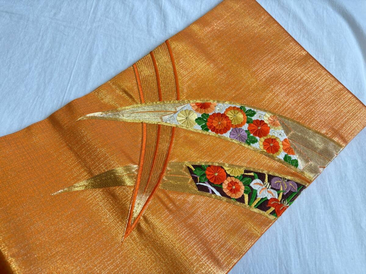 0010★名古屋帯*オレンジ*刺繍*開き仕立て*単衣*柄*着物*和服*和装*レトロ*アンティーク*女性*レディース*お得★