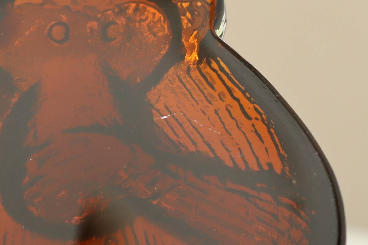 前面下方の足先部分に欠けが見られますがその他にひび、補修痕などは無く、ヴィンテージとしては良いコンディショ ンです。(6・7枚目画像参照) 画像の白い部分や色の薄い部分は光の反射によるもので色抜けなどは有りません。 光に透かすと背面一箇所に疵は見られますが、全体に艶も有って使用感はあまり感じられません。(8枚目画像参照) 背面に気泡粒が見られます。(9枚目画像参照) ヴィンテージ品には小さな気泡や異物の混入、ガラスの撚れや歪み、継目などが見られる場合も有りますが、これらが 製造された時代の製造技術、出荷基準では通常品扱いで販売されたものとして、ご理解をお願い致します。 経年や使用に伴う劣化、汚れ、疵などについては出来るだけ詳細に説明をしていますが、細かな状態の全てを記載する ことは出来ません。 また、状態についての受け止め方は個人によって其々異なりますので、ご不明な点など御座いま したらどうぞご遠慮なくお問い合わせ下さい。 |