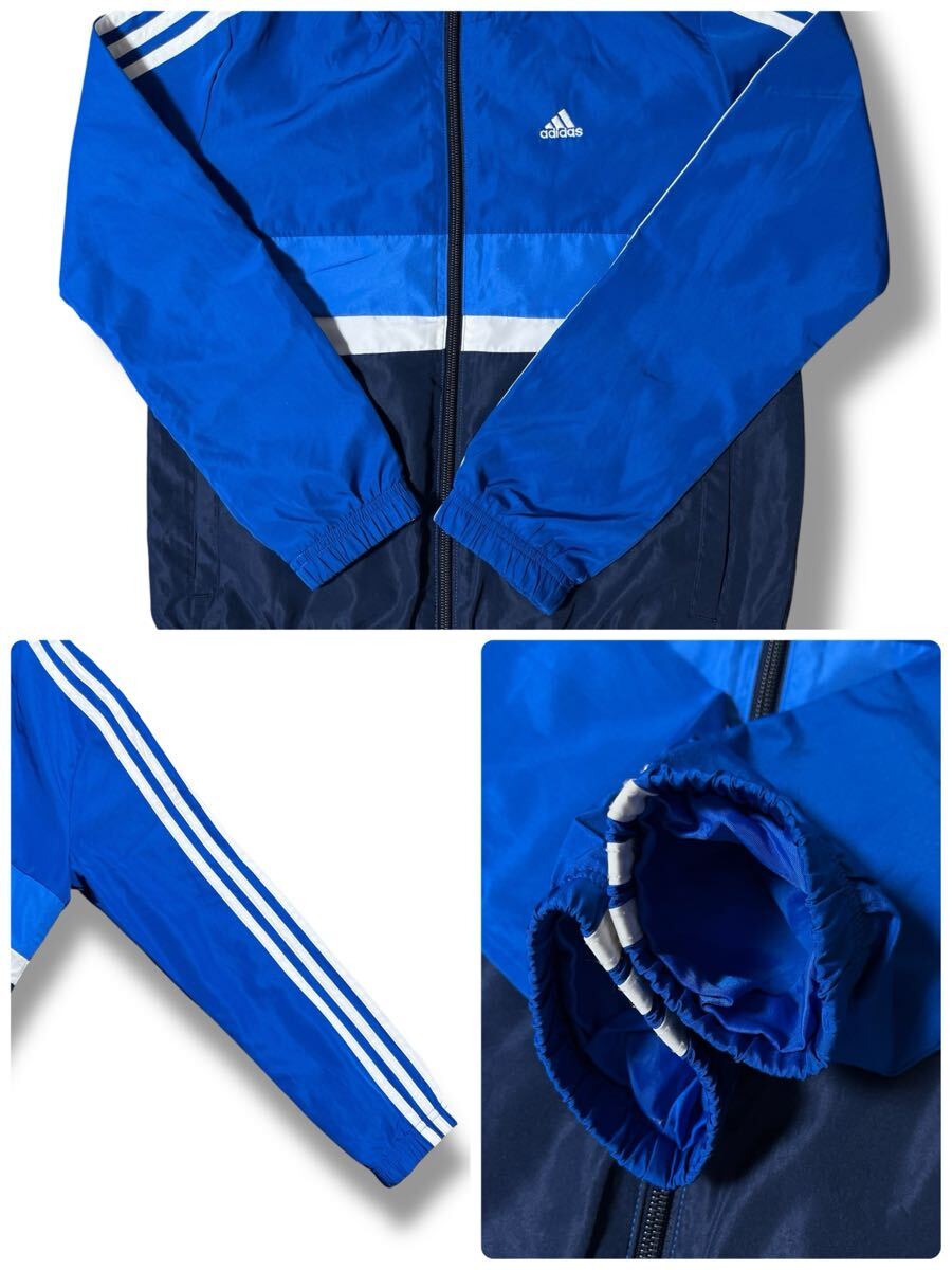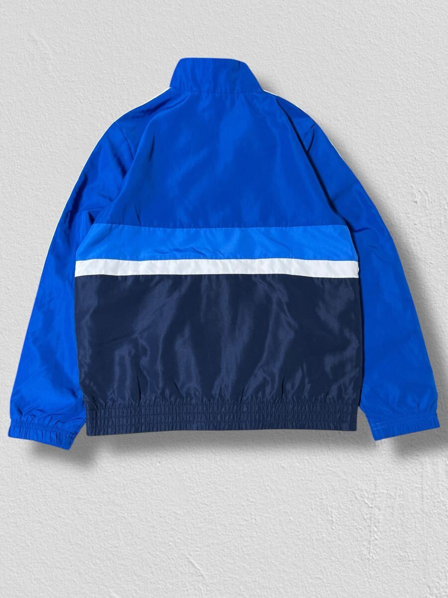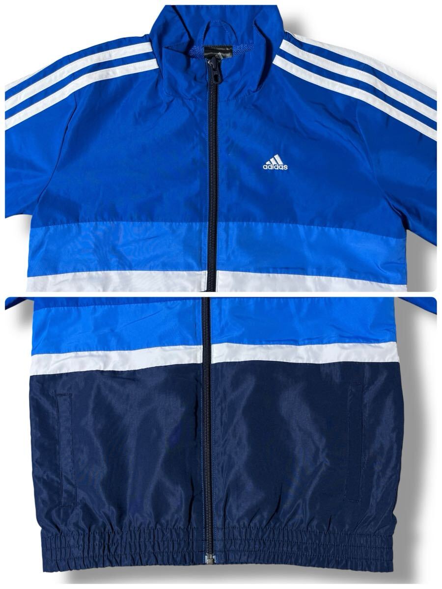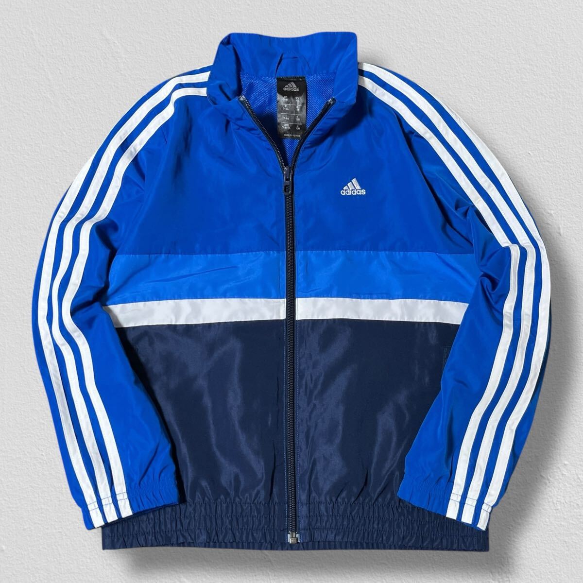 鮮やかなブルーにホワイトの3本ラインが映えるアディダスのナイロンジャケット。軽量で動きやすく、スポーツやカジュアルシーンで活躍します。裏地はメッシュ仕様で快適な着心地。