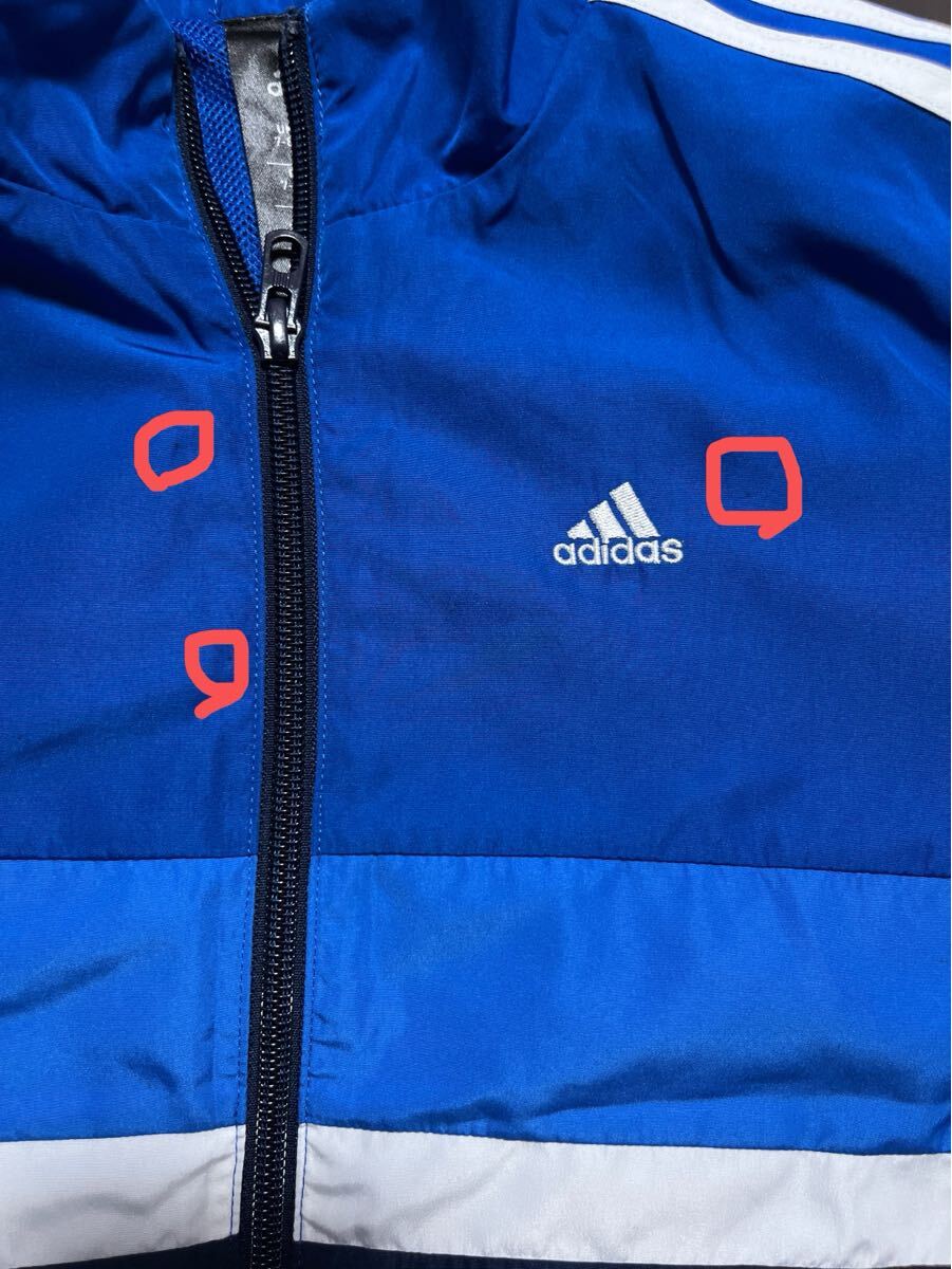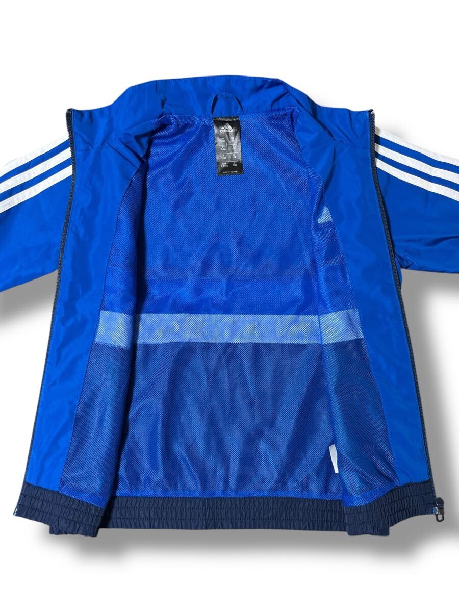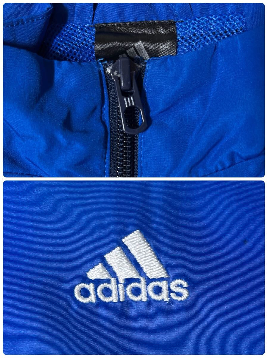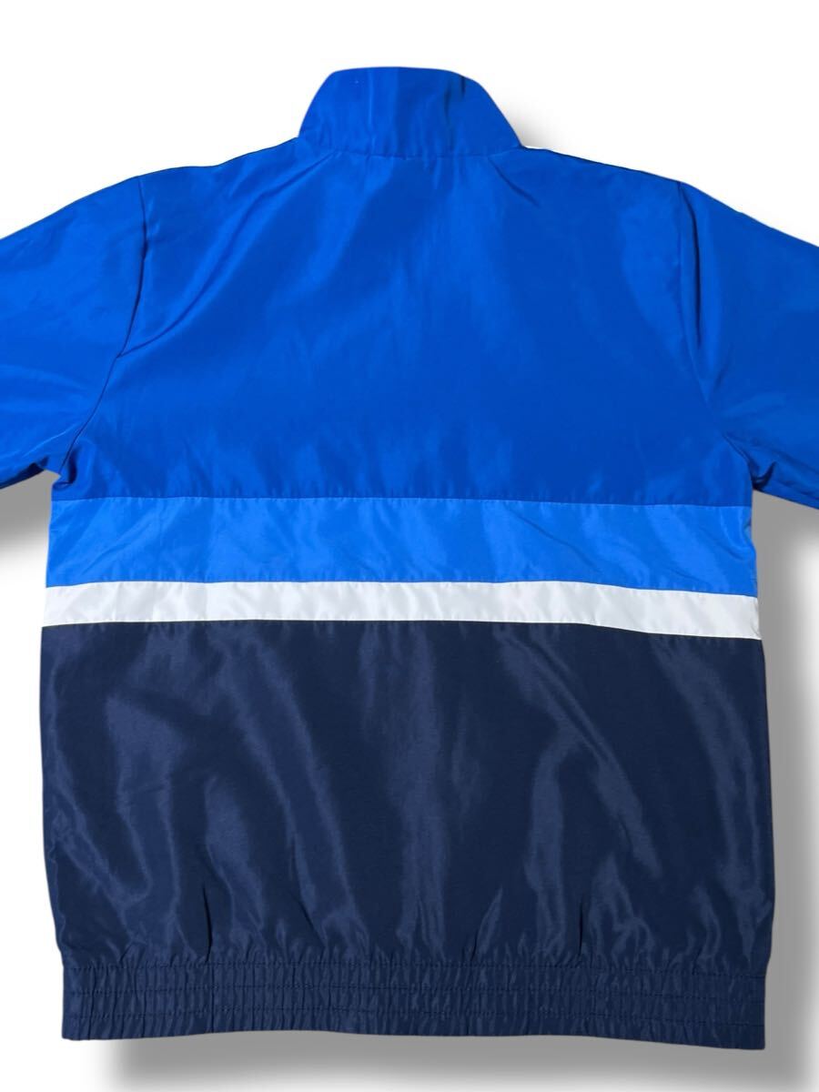 鮮やかなブルーにホワイトの3本ラインが映えるアディダスのナイロンジャケット。軽量で動きやすく、スポーツやカジュアルシーンで活躍します。裏地はメッシュ仕様で快適な着心地。