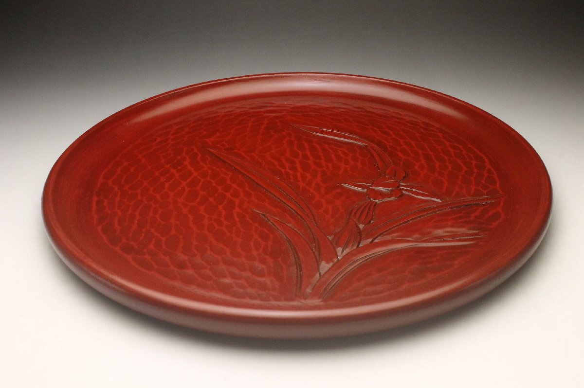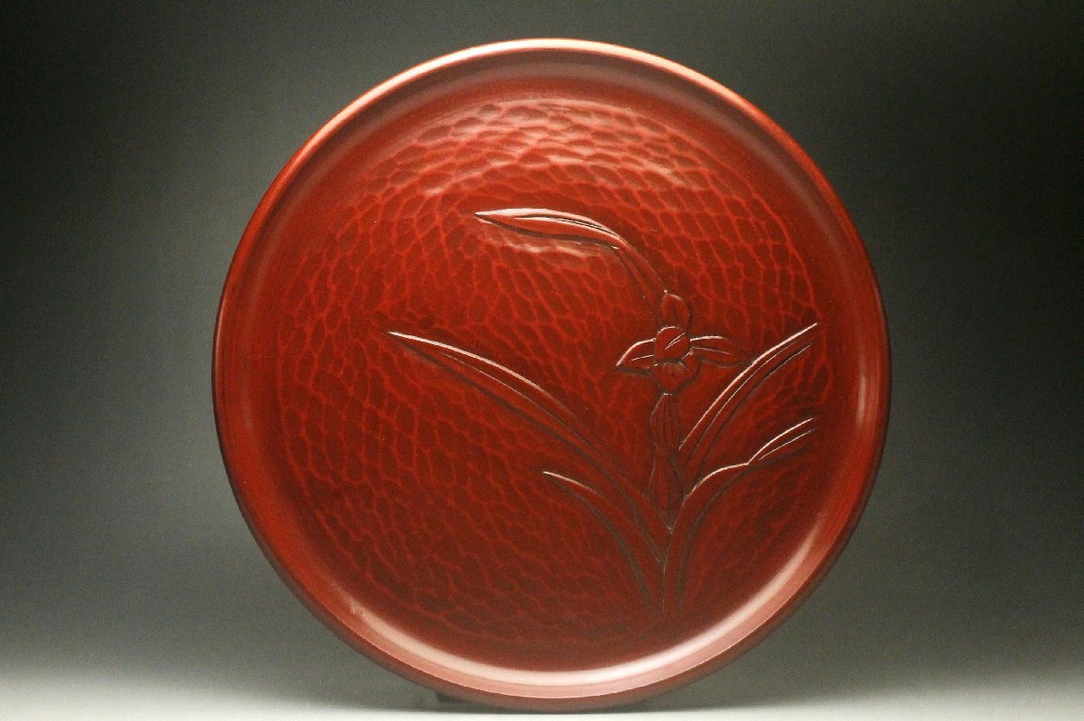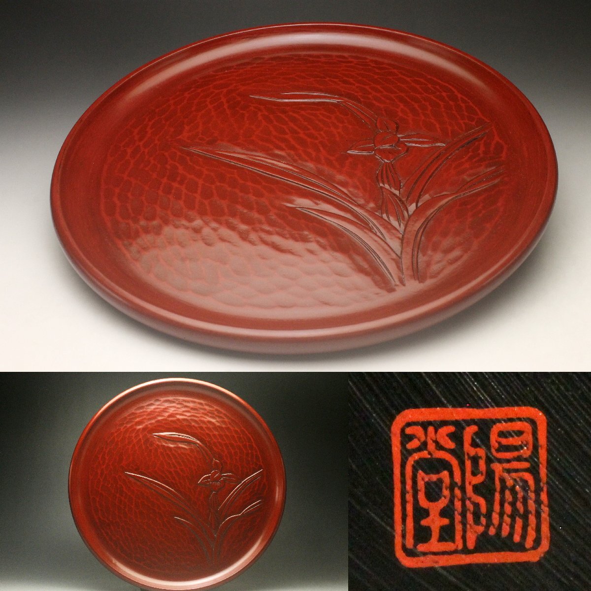 【余韻】 茶道具 鎌倉彫 陽堂 蘭文 丸盆★径:27cm 無傷美品<同梱可>