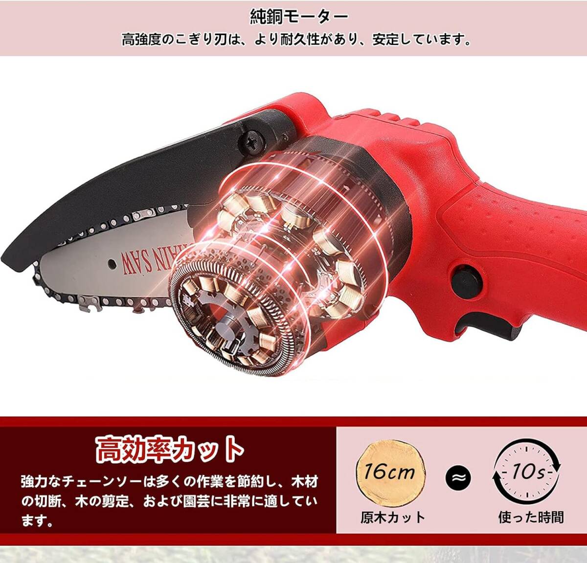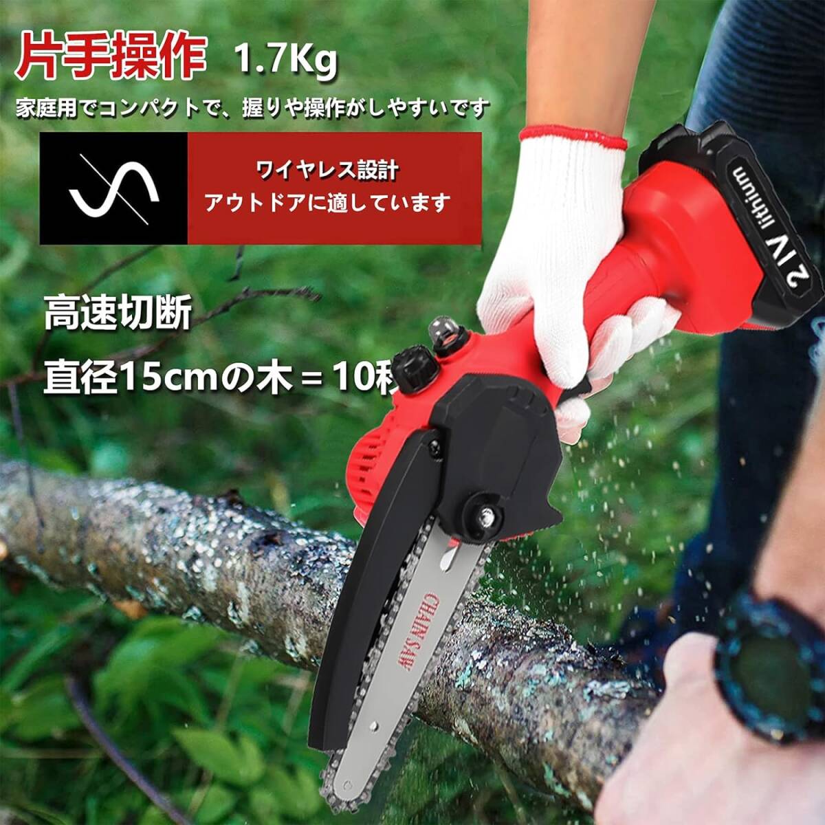 6m/sの高速なチェーンスピードにより、直径16センチの木材も10秒で切断可能。強力な純銅モータと21Vの大容量3.0Ahバッテリー2個を採用し、一度の充電で長時間の使用が可能です。