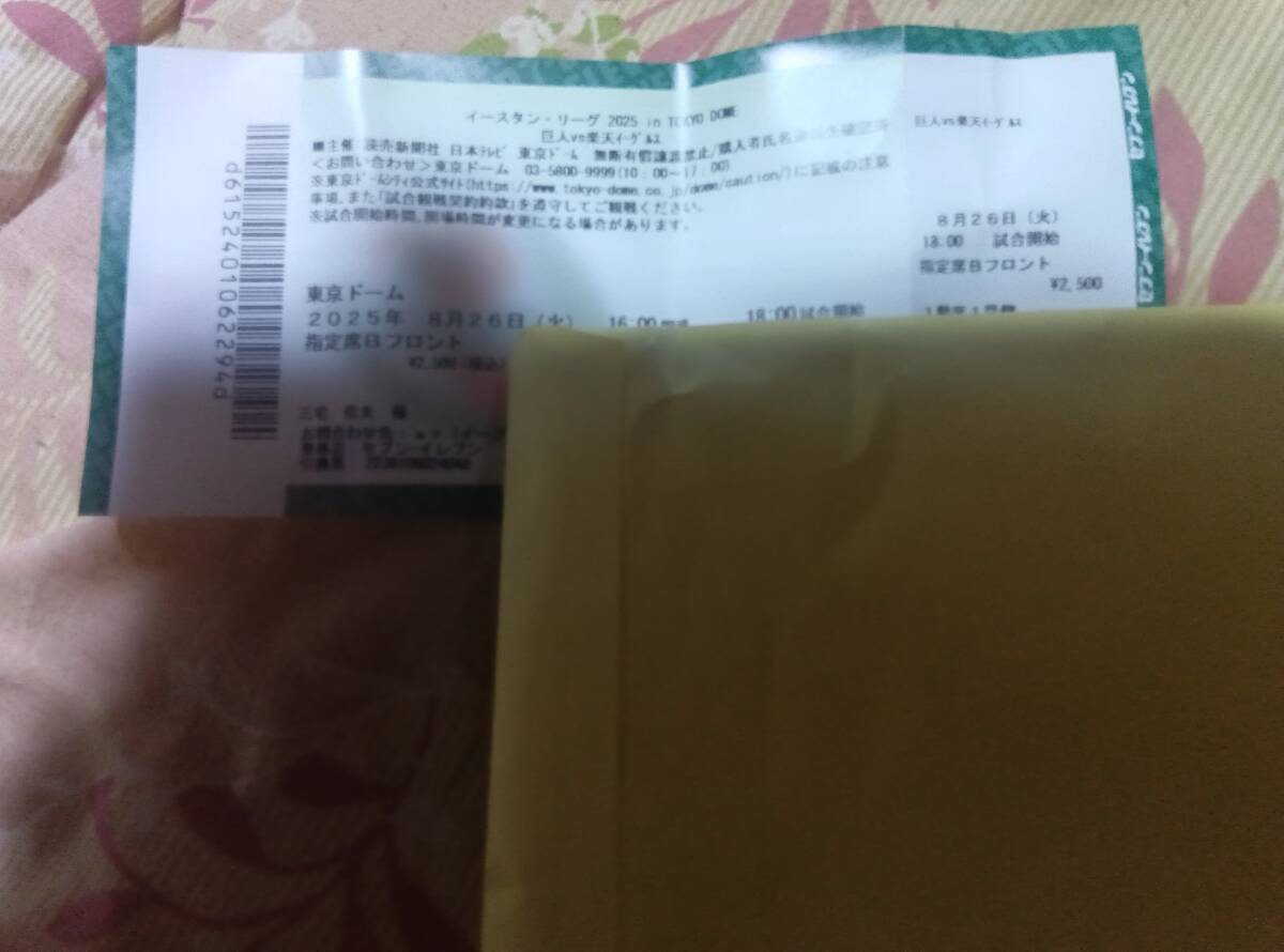 8月26日の東京ドームでの巨人対楽天イーグルス戦のイースタンリーグのチケット1枚