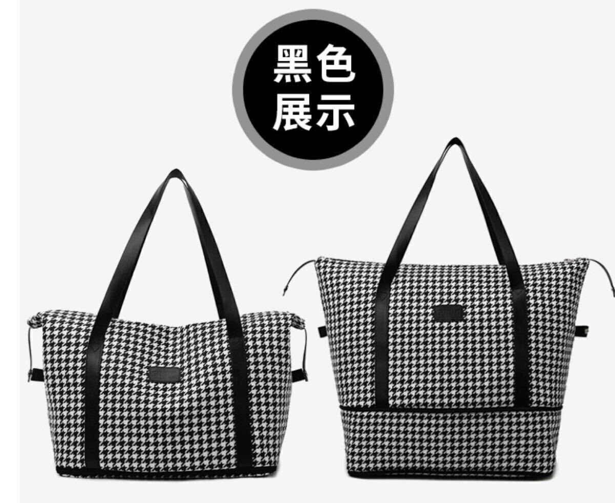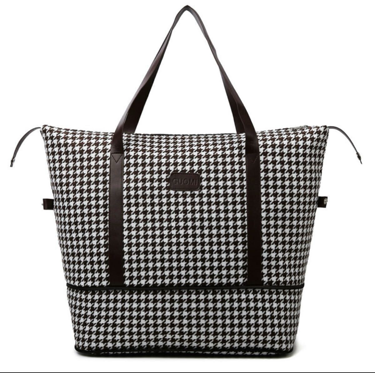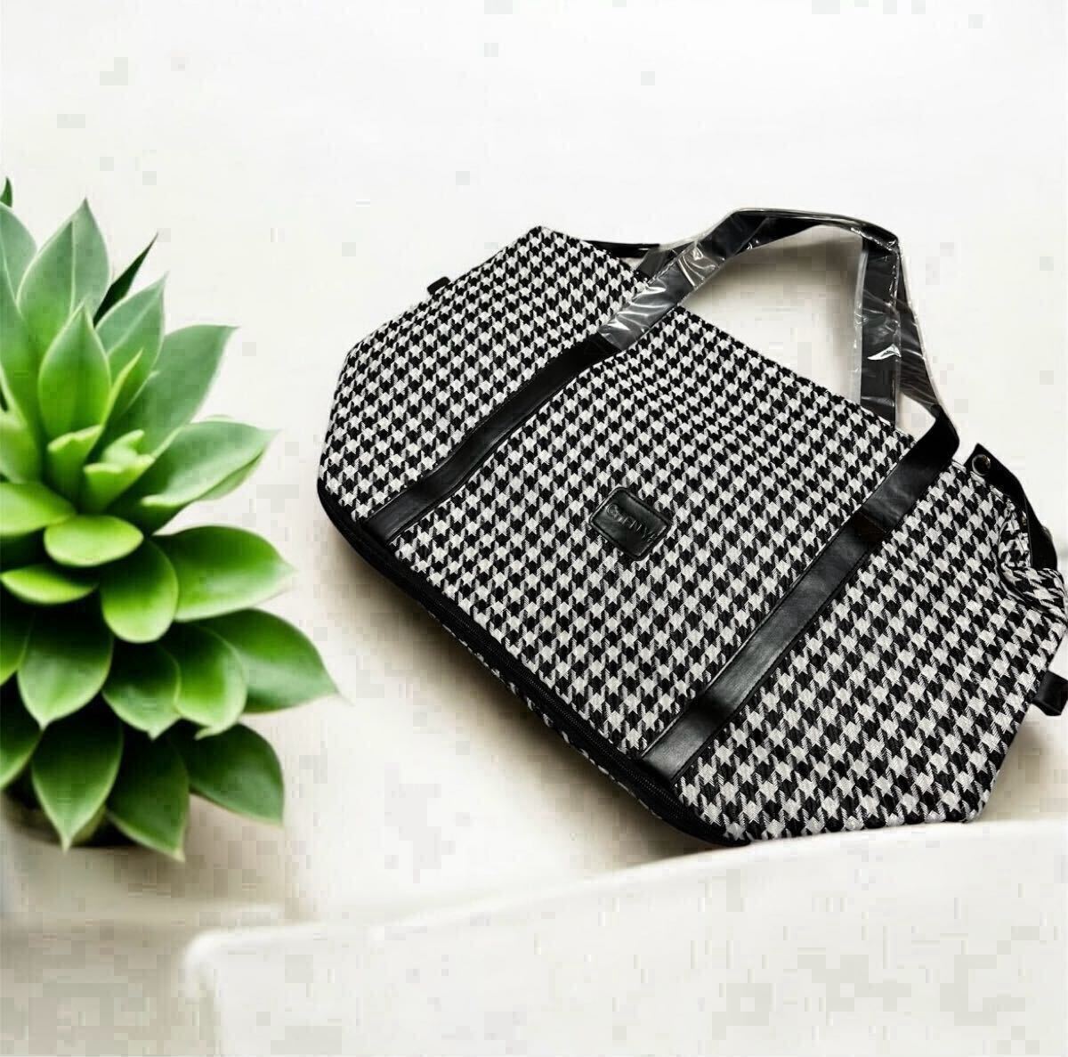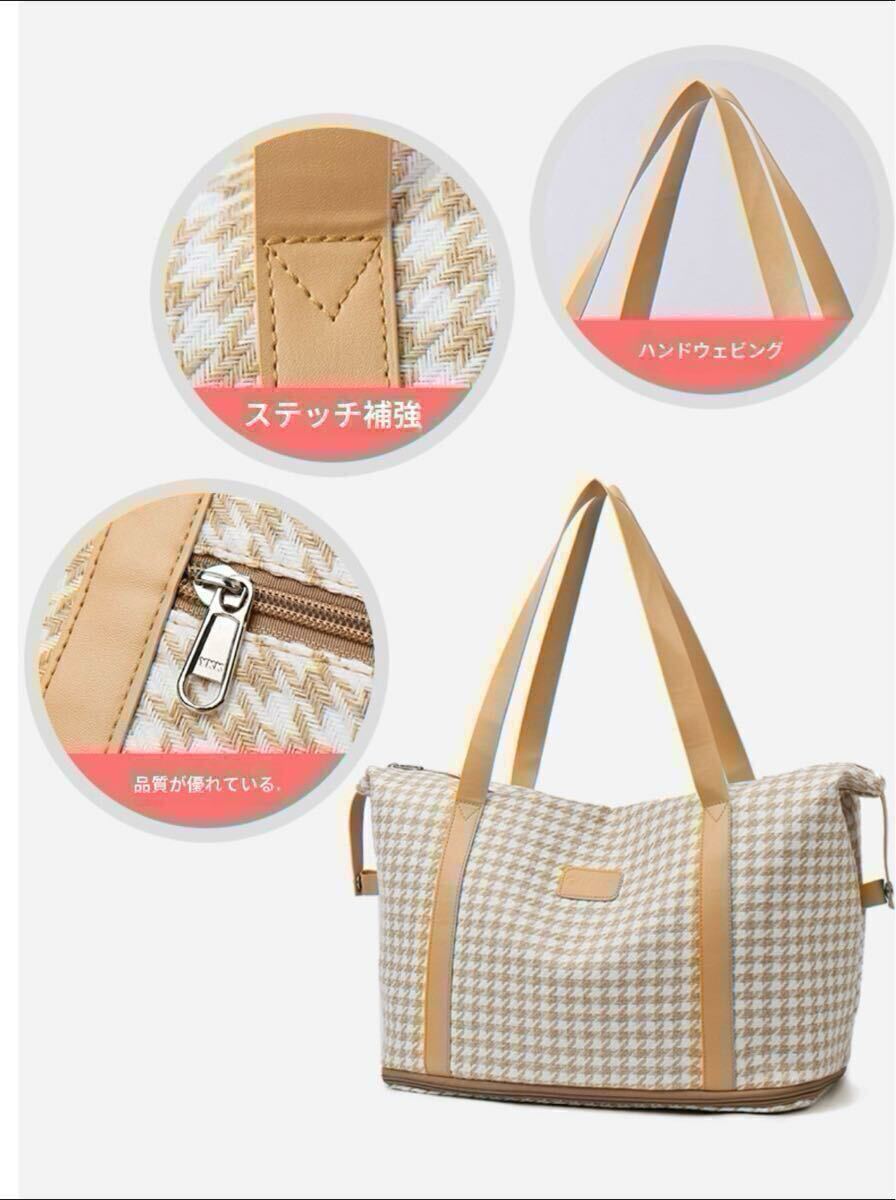 おしゃれな千鳥柄デザインは、どんなコーディネートにも自然に馴染みます。防水仕様で突然の雨にも安心、軽量で大容量だからたくさん荷物を収納可能です。
