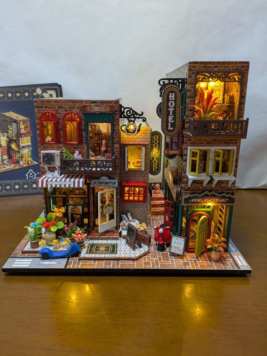 ミニチュア ドールハウスキット 組立済完成品 3階建ホテルとフラワーショップ ”LEDライト・防塵ケース・オルゴール付き” (電池別)