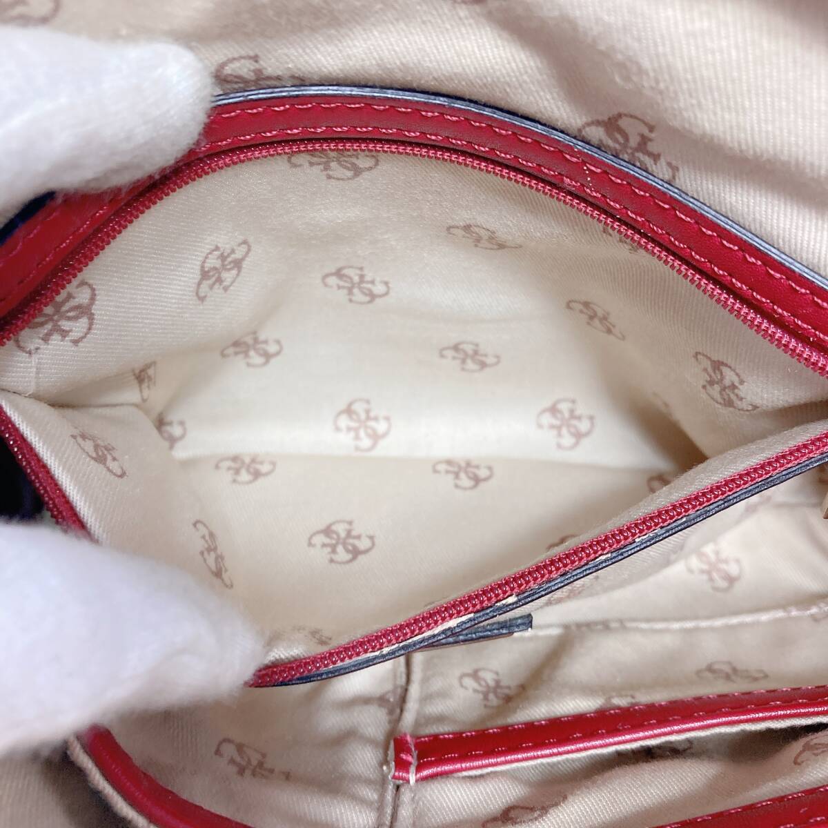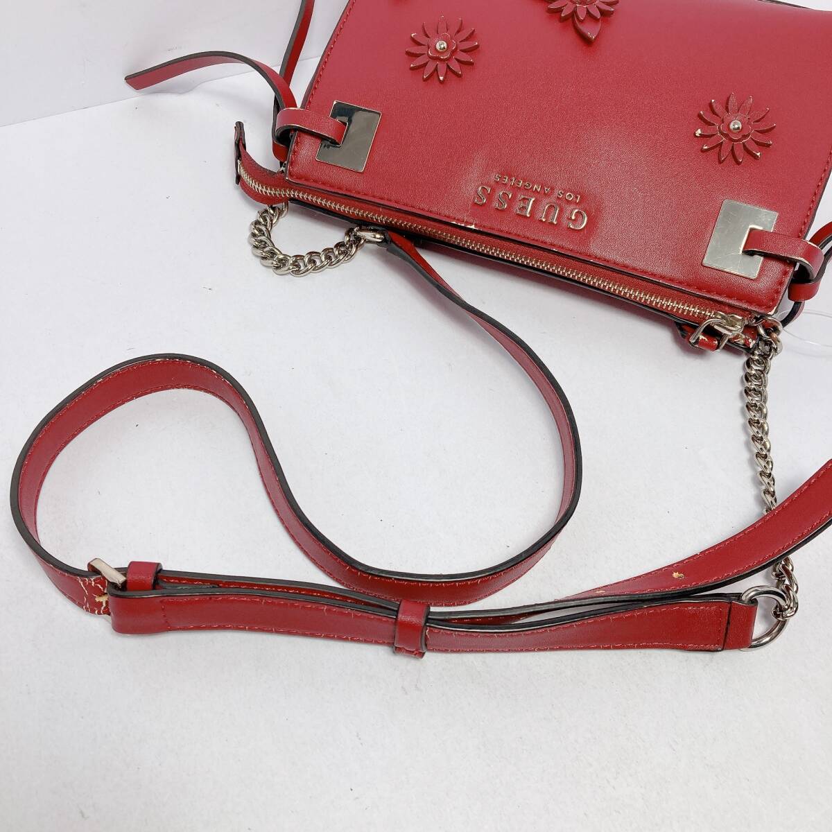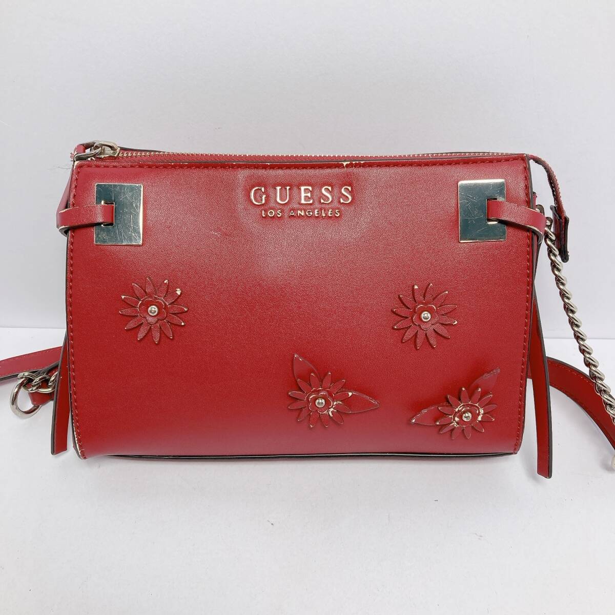 Y623 GUESS ゲス ショルダーバッグ レディース レッド 赤 花柄 フラワー レザーバッグ シルバー チェーンショルダー ファスナー