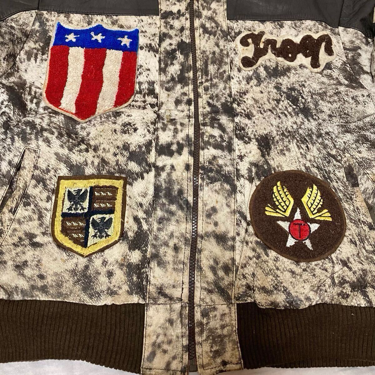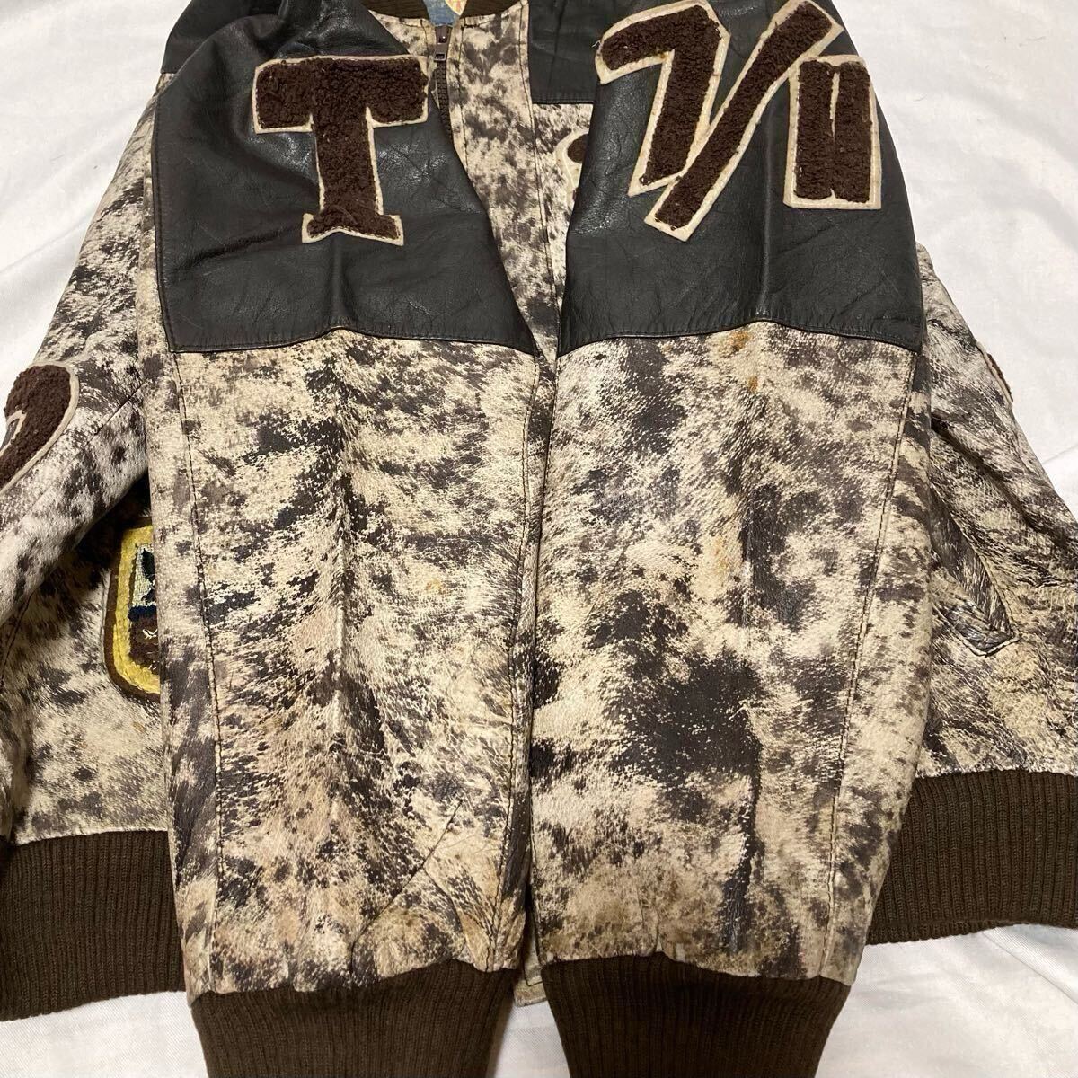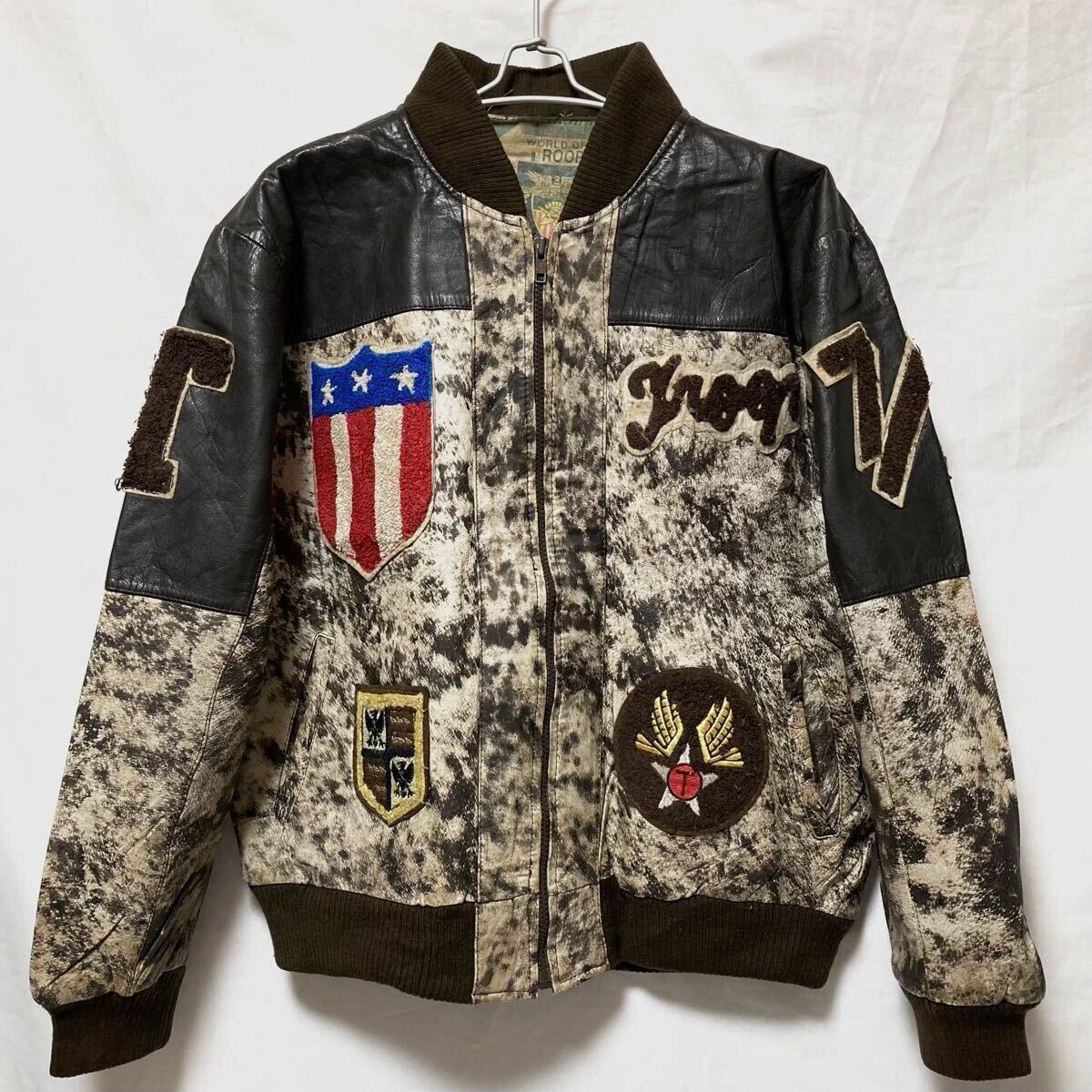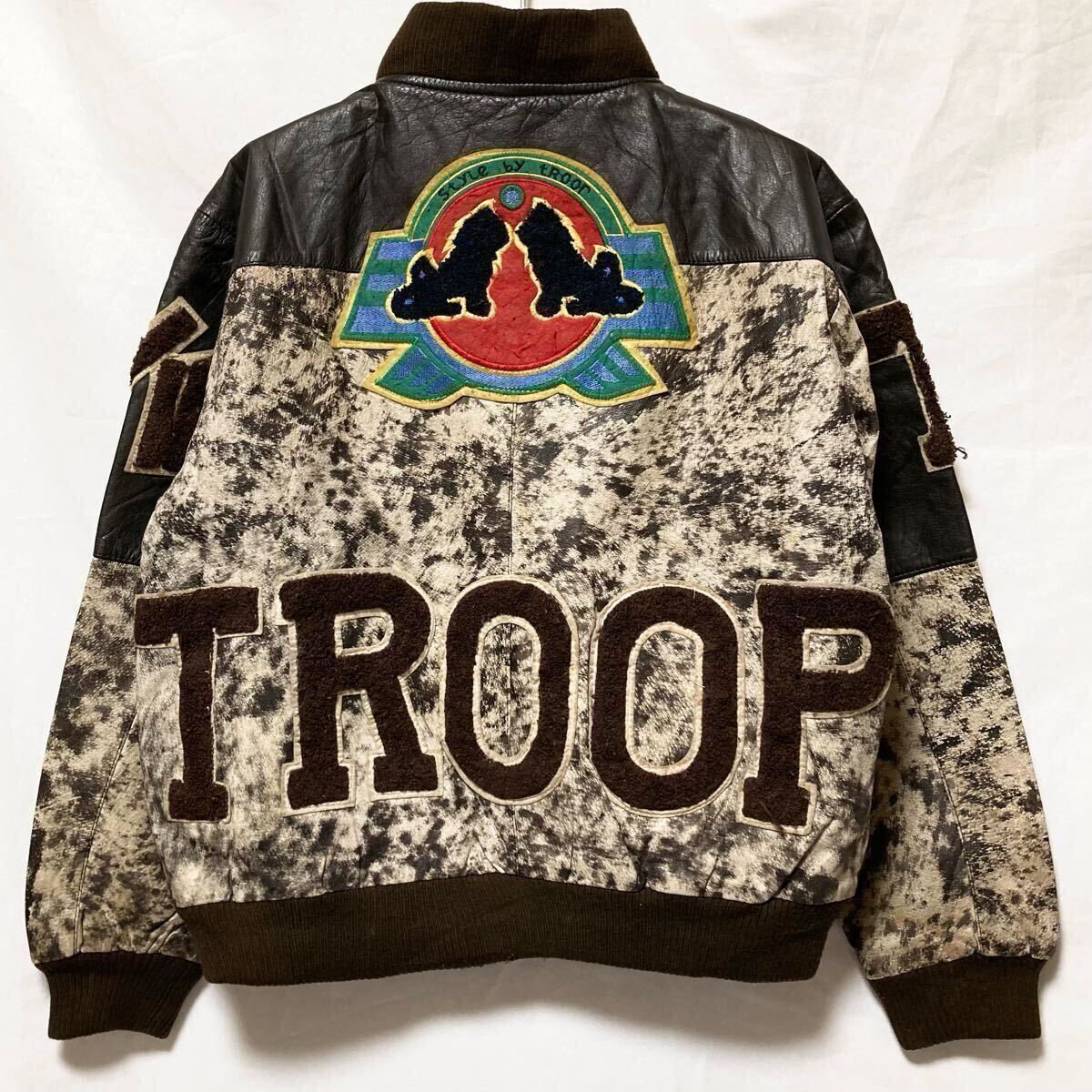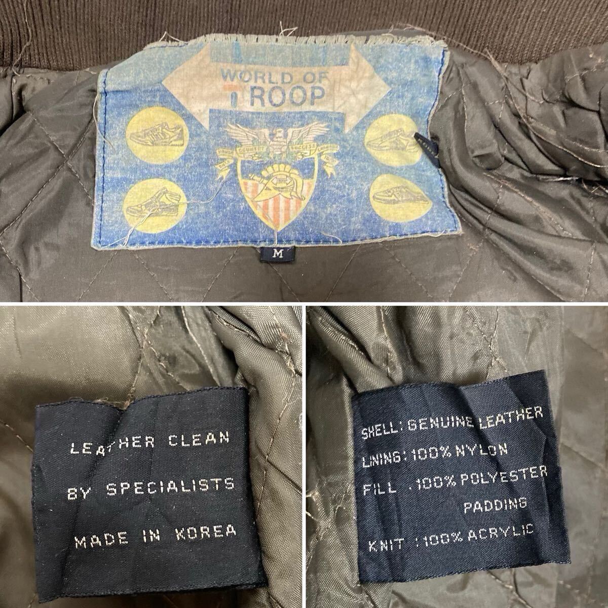 80s vintage WORLD OF TROOP LEATHER STADIUM JACKET トゥループ レザー 韓国製 スタジャン レザージャケット ロゴ ワッペン Mです。