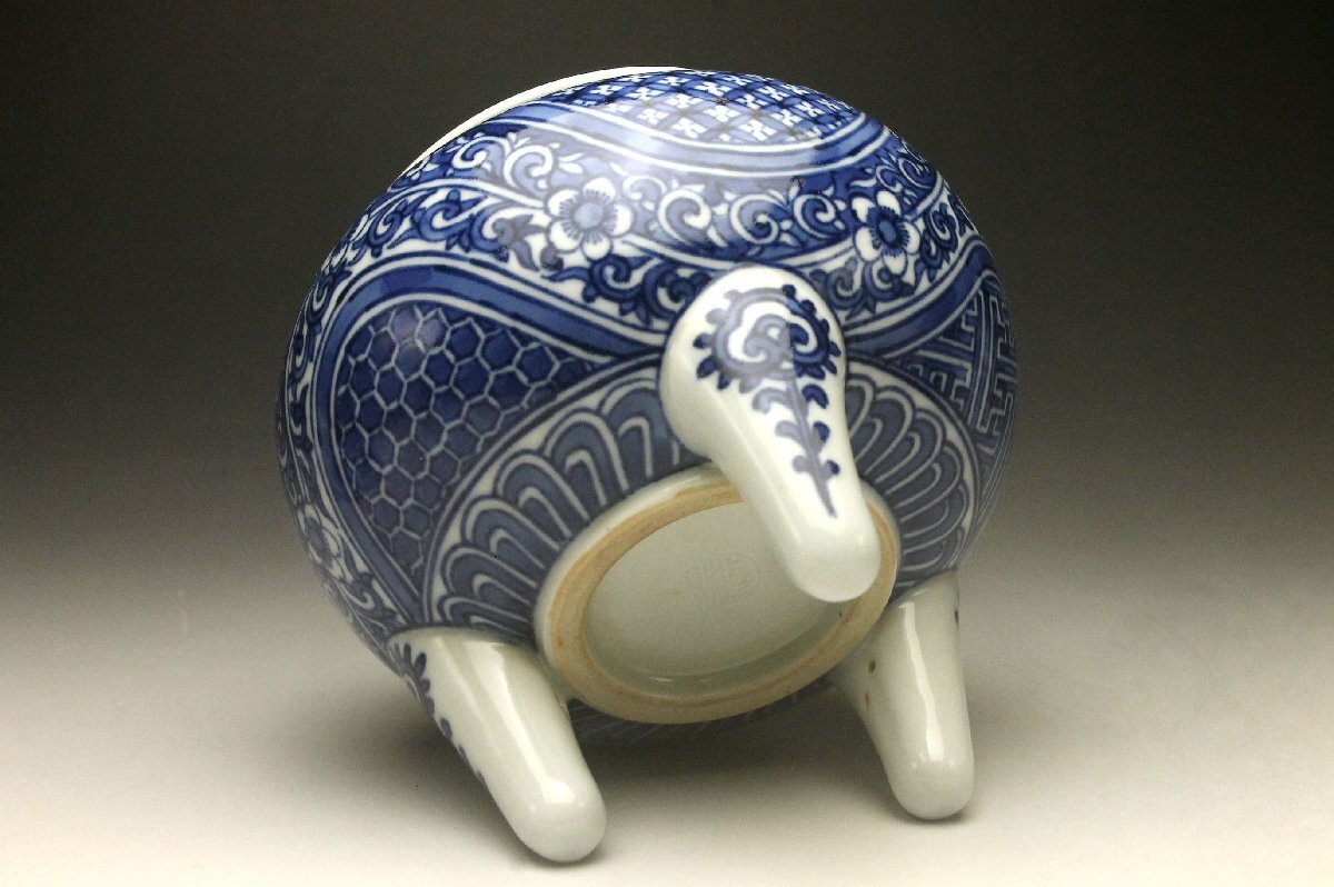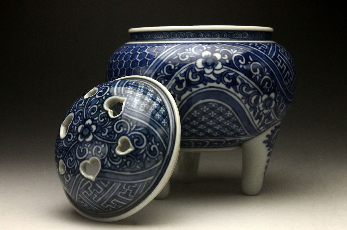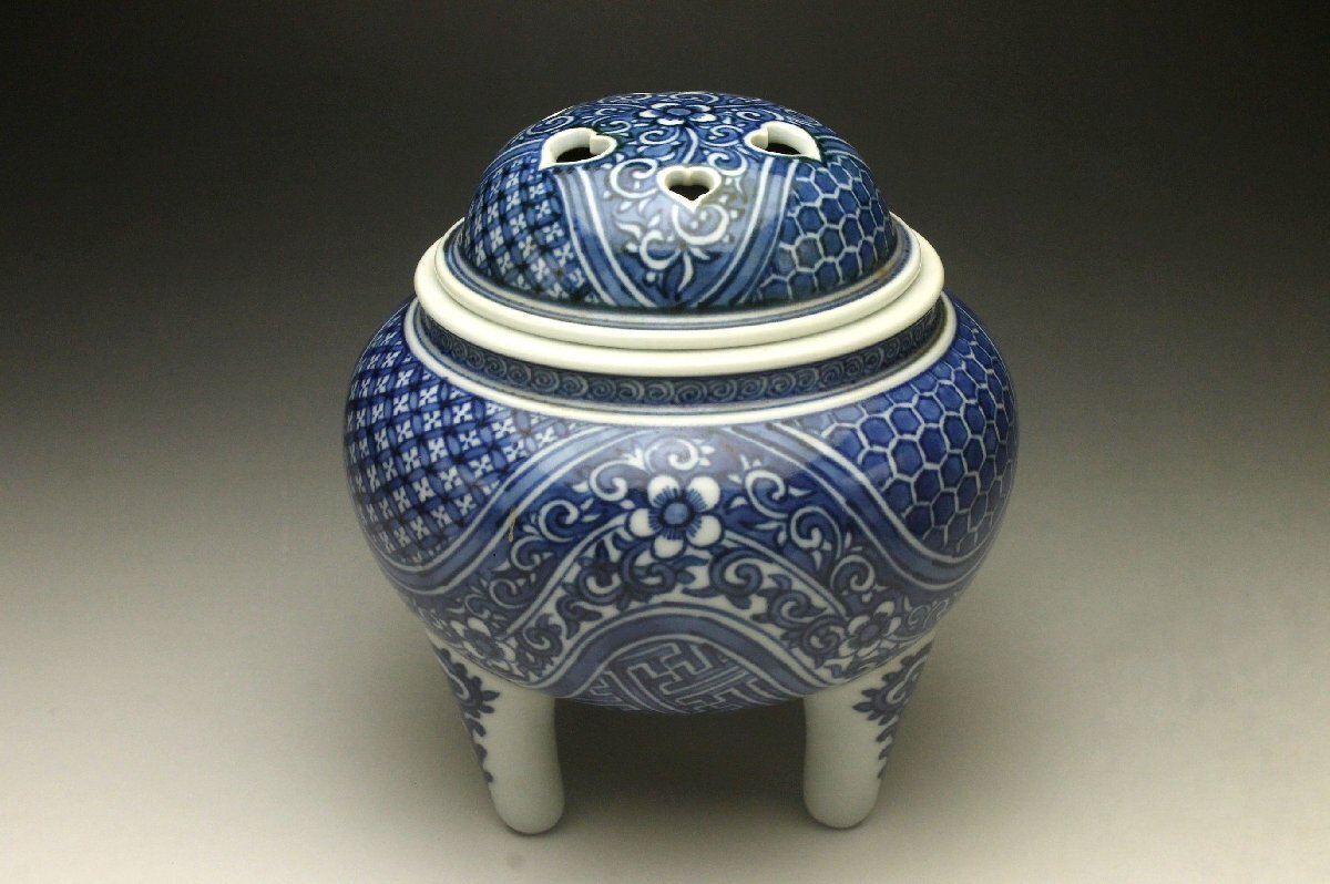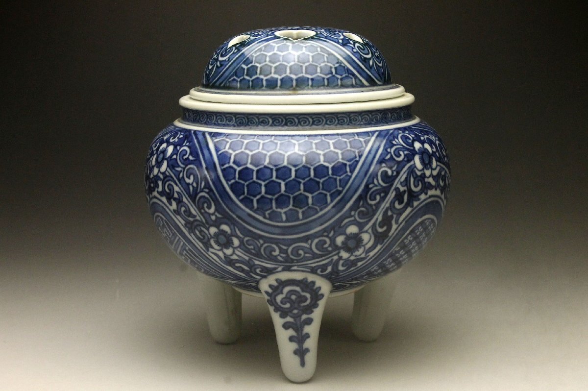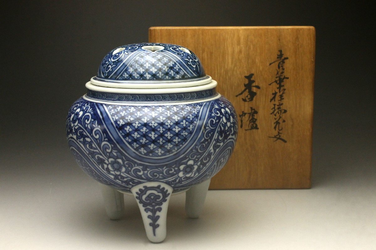 【余韻】 清水焼 北村賀善 青華祥瑞花文 香炉★無傷美品 茶道具 共箱<同梱可>